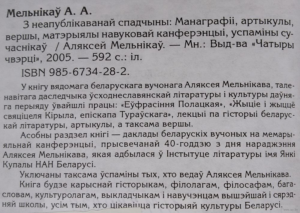 Аляксей Мельнікаў. З неапублікаванай спадчыны: манаграфіі, артыкулы, вершы, матэрыялы навуковай канферэнцыі, успаміны сучаснікаў. Мінск. Чатыры чвэрці, 2005 г. 589 с. Мяккая вокладка.