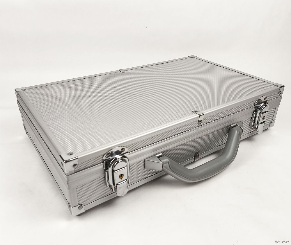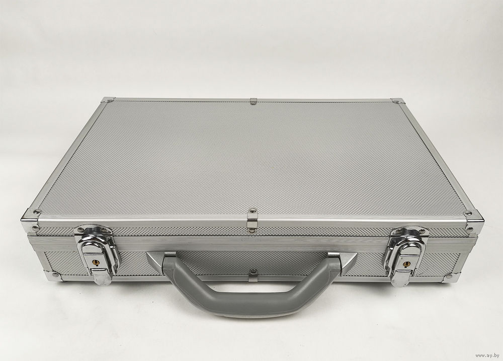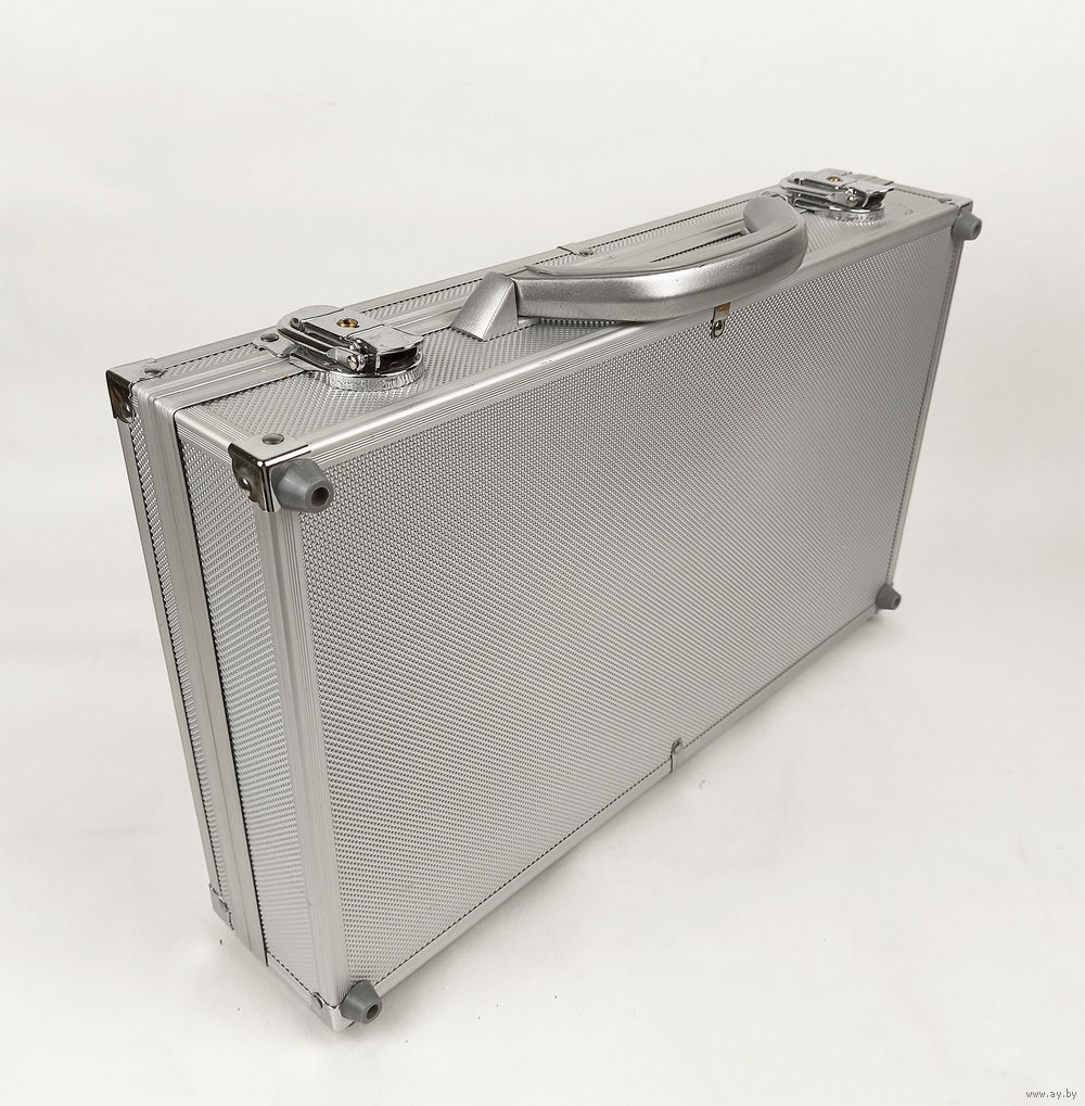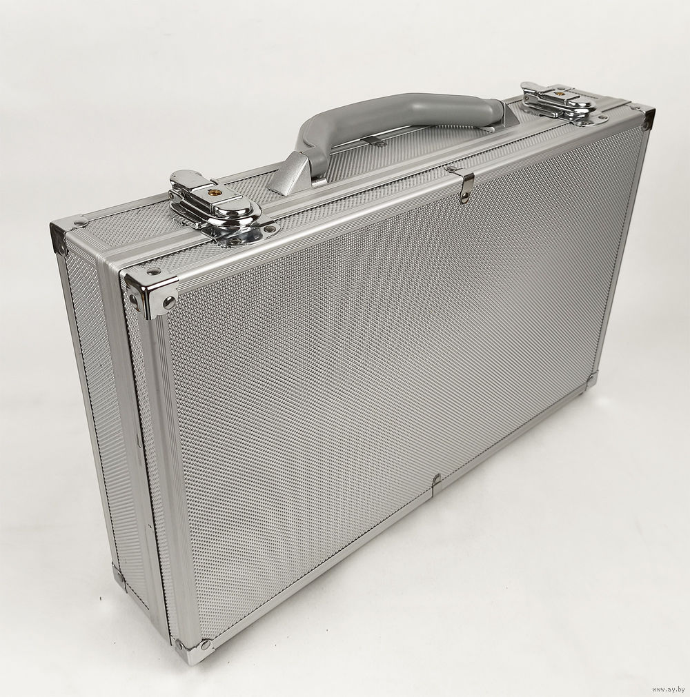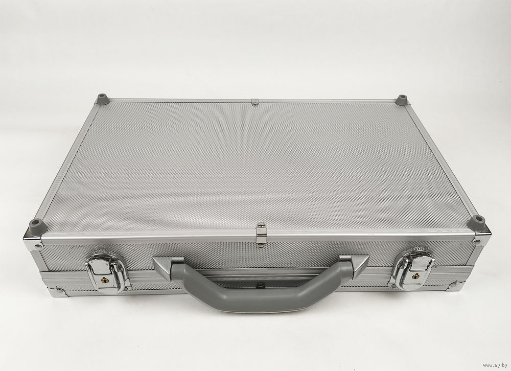 Алюминий / пластик, велюровая обивка, 2 замка на крышке, ручка для переноски, 1 ключ в комплекте. В использованиии не был.