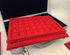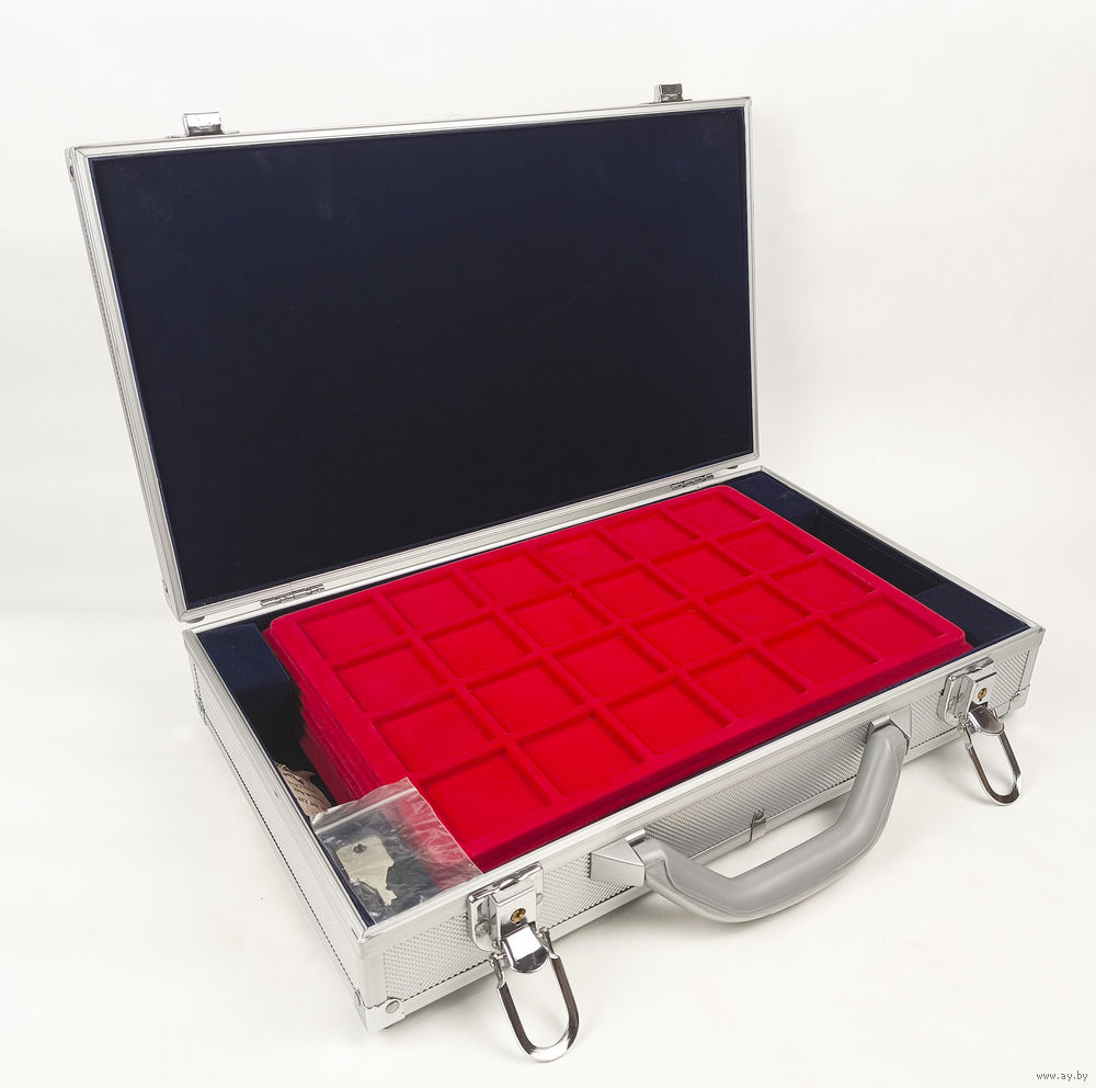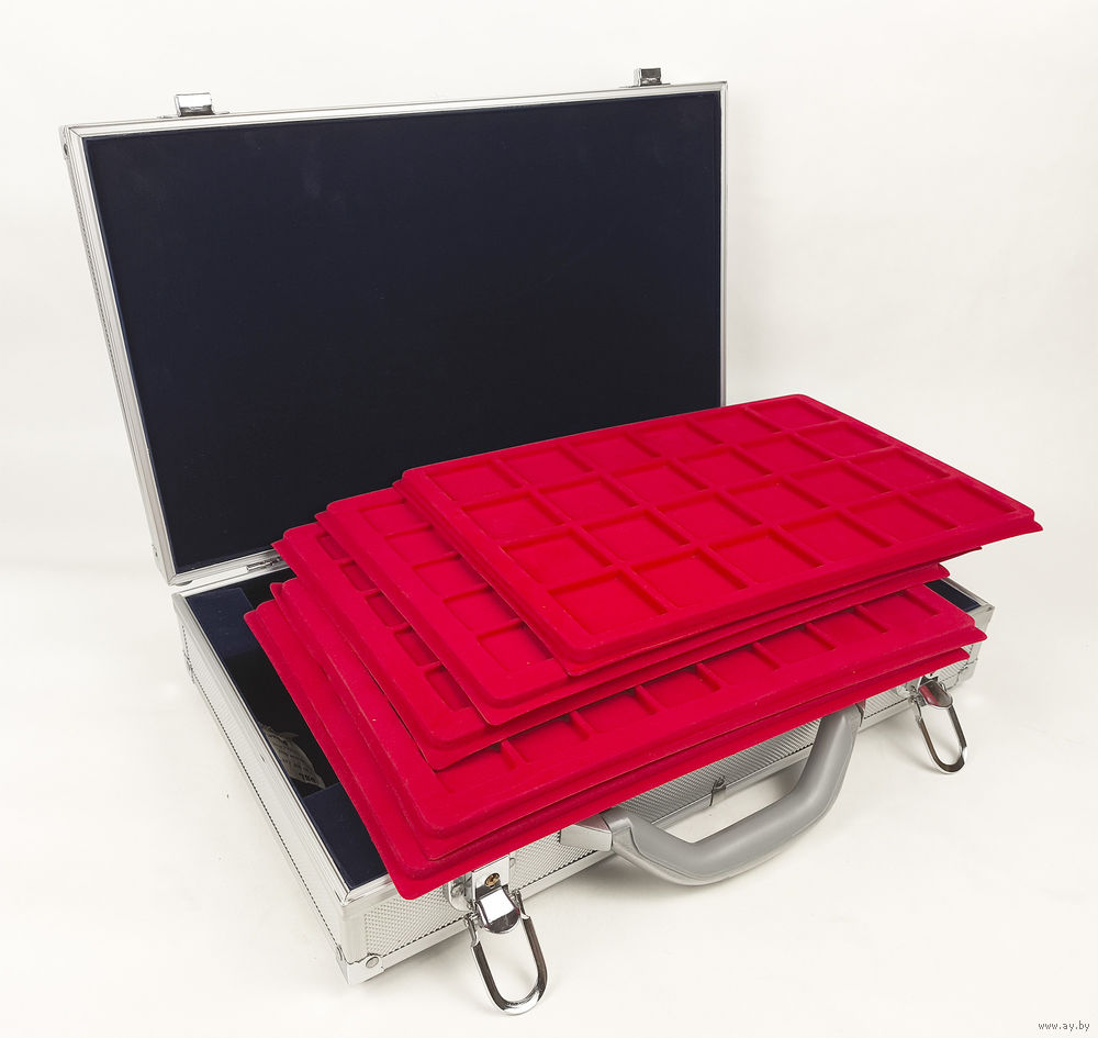 Внутри кейс обшит синим велюром. В комплекте 4 планшета по 40 ячеек (размер ячейки 33х33 мм.) и 1 планшет на 24 ячейки (размер ячейки 45х45 мм.). Планшеты укладываются друг на друга. Для удобного вынимания планшетов по бокам кейса сделаны специальные углубления для рук. Четыре полимерных ножки на дне кейса надёжно защитят поверхность вашего стола от царапин и повреждений.