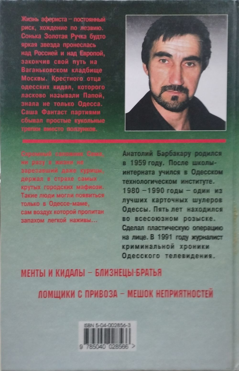 Тираж 7000 экз. 432 стр. Жизнь афериста - постоянный риск, хождение по лезвию. Сонька Золотая Ручка будто яркая звезда пронеслась над Россией и над Европой, закончив свой путь на Ваганьковском кладбище Москвы. Крестного отца одесских *кидал*, которого ласково называли Папой, знала не только Одесса. Саша Фантаст партиями сбывал простые кукольные тряпки вместо ползунков. Скромный сапожник Сема, ни разу в жизни не зарезавший даже курицы, держал в страхе самых самых крутых городских мафиози. Такие люди могли появиться только в *Одессе - маме*, сам воздух которой пропитан запахом легкой наживы...