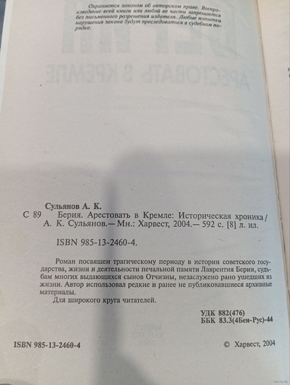 Книга Анатолия Сульянова "Берия. Арестовать в Кремле" — документально-художественное повествование, посвященное трагическому периоду в истории советского государства, жизни и деятельности Лаврентия Берии, судьбам многих выдающихся деятелей страны, незаслуженно рано ушедших из жизни . Автор использовал редкие и ранее не публиковавшиеся архивные материалы . Издание 2004 года, издательство "Харвест" (Минск).