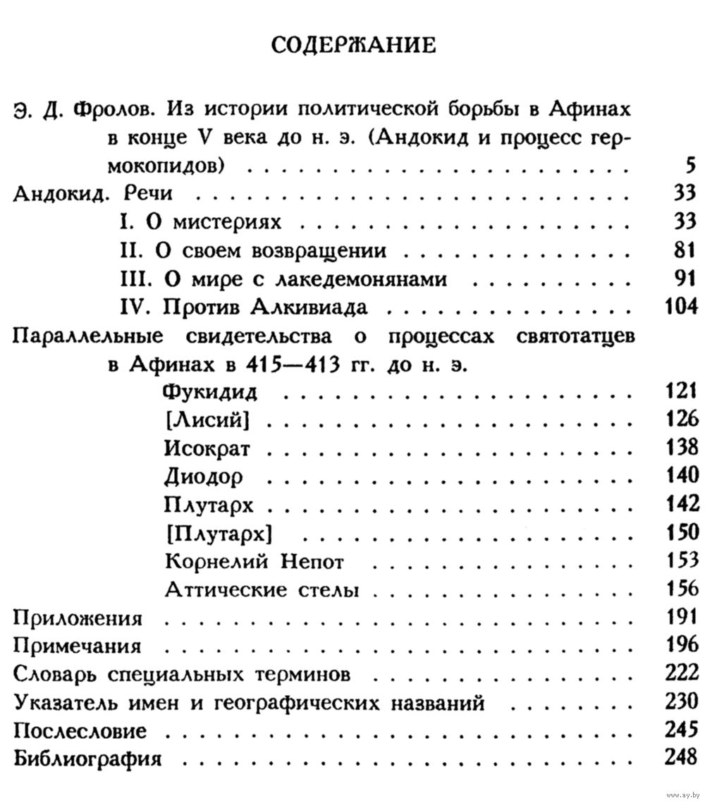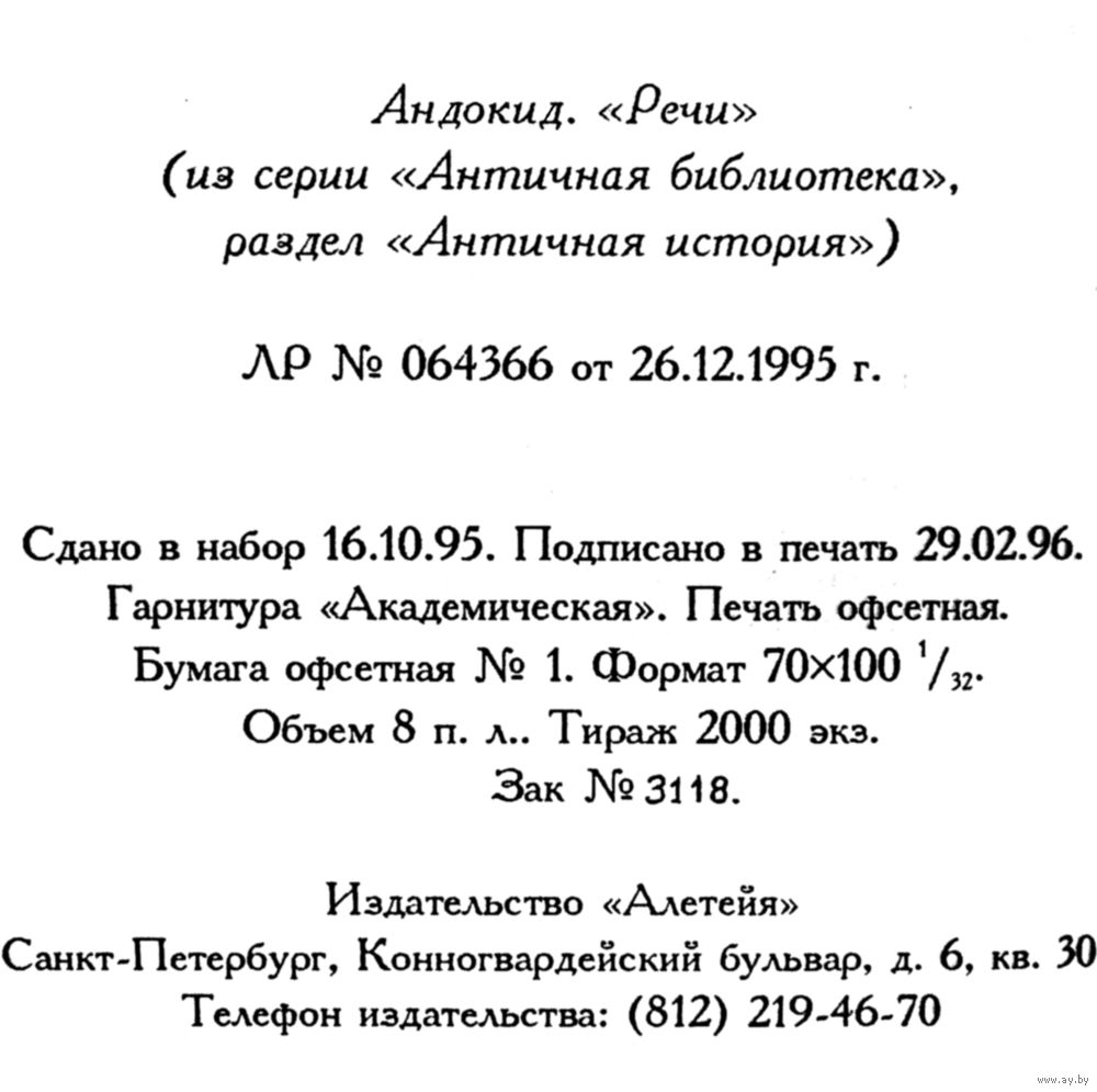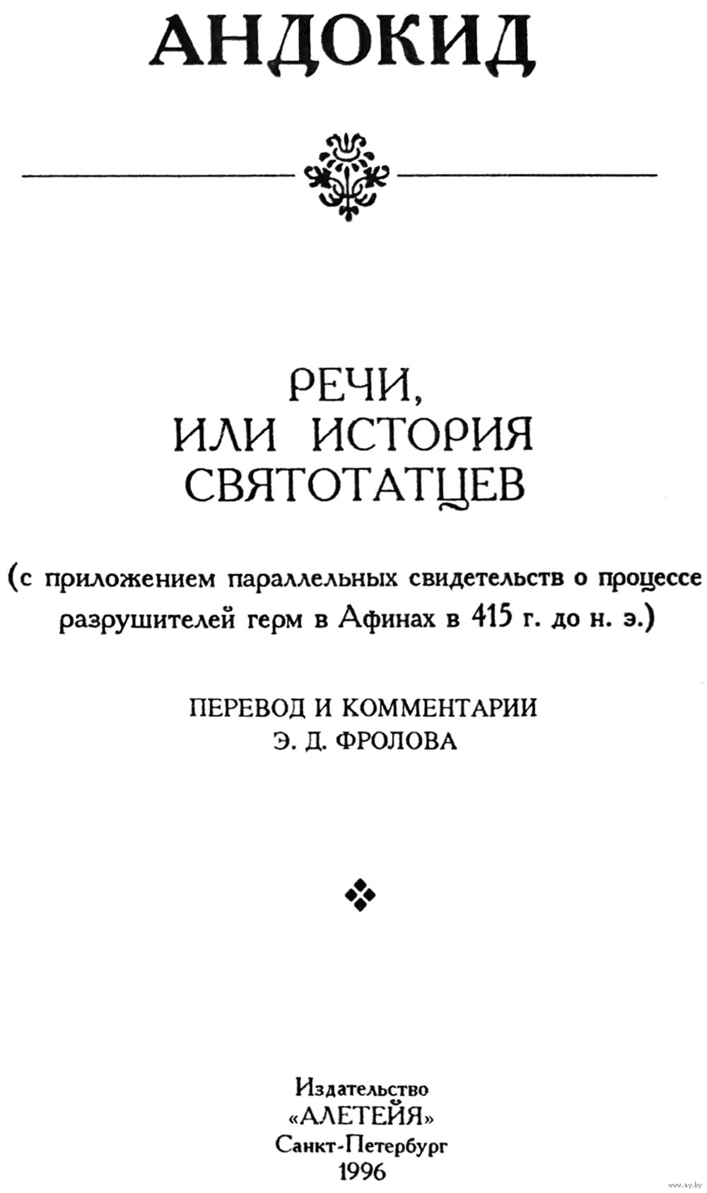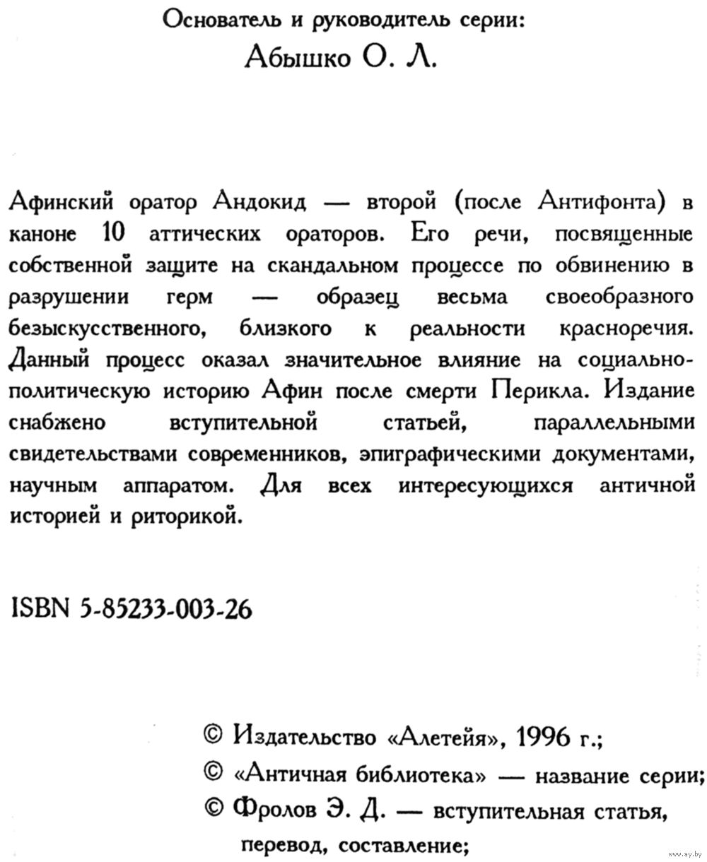Андокид "Речи или История святотатцев", серия"Античная Библиотека". Для широкого круга читателей. Твёрдый переплет. Издательство "Алетейя". 256 стр. ISBN: 5-85233-003-26. Год издания - 1996. Тираж 2000 экз. Первое и единственное издание. Больше переизданий НЕ было. Очень большая библиографическая редкость.