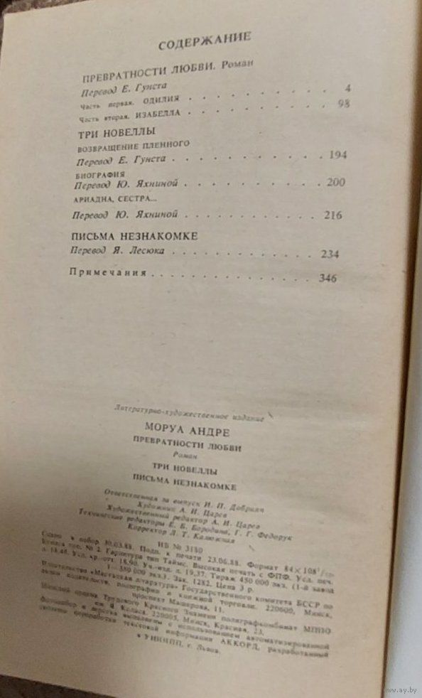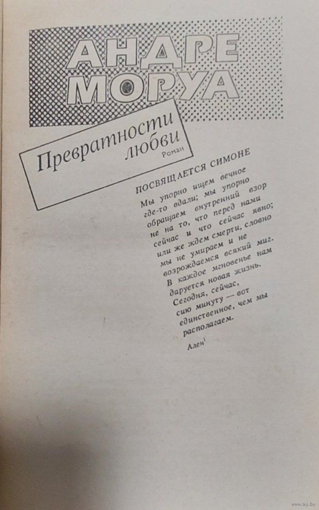 В книгу французского писателя А. Моруа (1885-1967) вошли известный роман «Превратности любви» (1928), посвященный жизни высших кругов буржуазного общества, три новеллы и «Письма незнакомке» (1953), трактат, в котором автор изложил свои взгляды на морально- этические проблемы счастья в супружеской жизни.