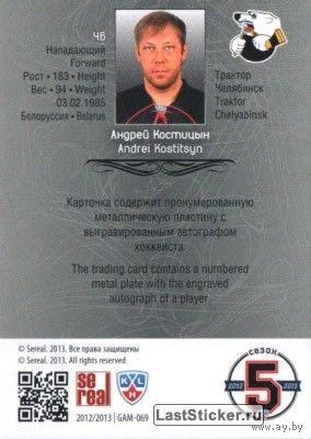 Андрей Костицын - "Трактор" Челябинск - Карточка - "Автограф 124/150 - Ключевые Игроки" - Сезон 2012/13 года.