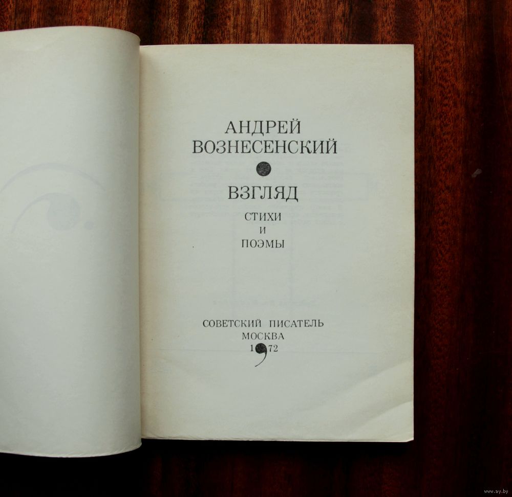 "Взгляд" - новая лирическая книга Андрея Вознесенского. Это девятый сборник стихов, выпускаемый поэтом. В него вошли стихи и поэмы из числа написанных автором за последнее время. Как и показывает название, цель автора - `остановить взглядом мгновение`, увидеть сущность события и предмета через их внешнюю форму, вещность, оболочку. В книгу органично входят лирические репортажи, историческая тема соседствует с темой любви и природы.