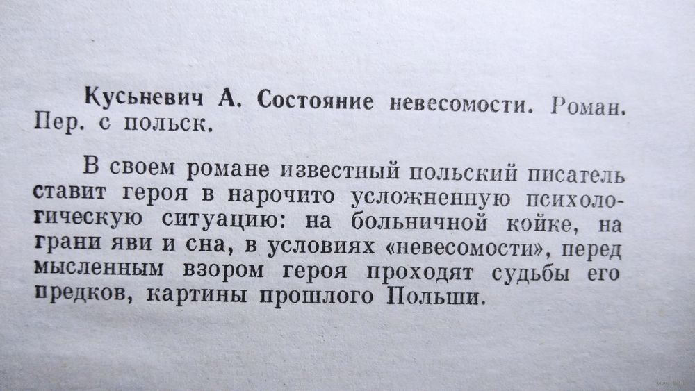 В своем романе известный польский писатель ставит героя в нарочито усложненную психологическую ситуацию: на больничной койке, на грани яви и сна, в условиях невесомости, перед мысленным взором героя проходят судьбы его предков, картины прошлого Польши.