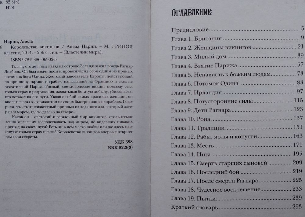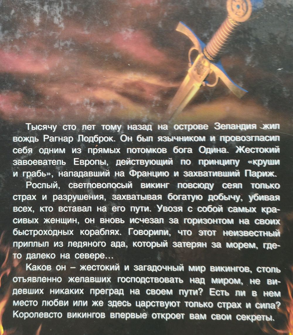 5000 экз. 238 стр. Тысячу сто лет тому назад на острове Зеландия жил вождь Рагнар Лодброк. Он был язычником и провозгласил себя одним из прямых потомков бога Одина. Жестокий завоеватель Европы, действующий по принципу "круши и грабь", нападавший на Францию и едва не захвативший Париж. Рослый, светловолосые викинг повсюду сеял только страх и разрушения, захватывая богатую добычу, убивая всех, кто вставал на его пути. Увозя с собой самых красивых женщин, он вновь исчезал за горизонтом на своих быстроходных кораблях. Говорили, что этот неизвестный приплыл из ледяного ада, который затерян за морем, где-то далеко на севере. Каков он - жестокий и загадочный мир викингов, столь отъявленно желавших господствовать над миров, что не видевших никаких преград на своем пути? Есть ли в нем место любви или же здесь царствуют только страх и сила? Королевство викингов впервые откроет вам свои секреты.