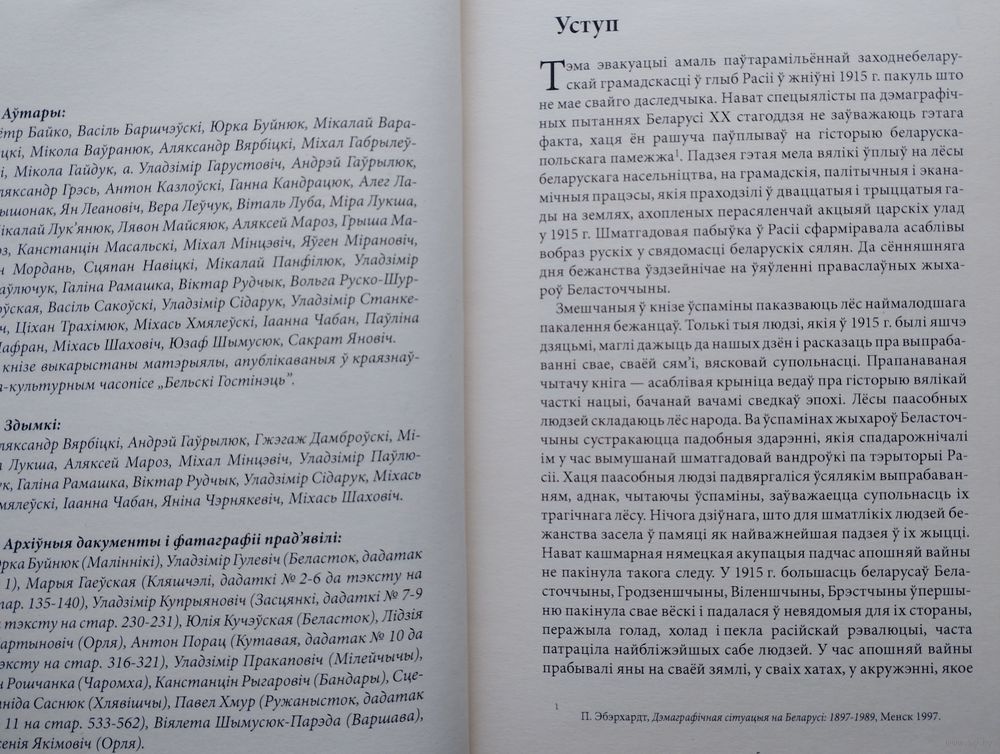 Вялікі фармат. 576 стар. Лета 1915 года. Расійская армія пад напорам нямецкага войска мусіць адступаць з тэрыторыі Польшчы, Беларусі, Украіны ўсё далей на ўсход. Па вёсках і самі сабой, і мэтанакіравана шырацца самыя неверагодныя чуткі пра тое, што германцы нібыта паводзяць сябе зусім бесчалавечна, а таму адзінае выйсце — ратавацца ўцёкамі. Углыб Расійскай імперыі з яе заходніх рэгіёнаў кіруюцца гружаныя фурманкі. З этнічна беларускіх Беласточчыны ды Гарадзеншчыны выязджаюць нават да 80% насельніцтва. Усяго ў бежанства выправіліся да 2 мільёнаў чалавек. Яны едуць у спякоце, часта без ежы і вады, церпяць шмат бедаў, масава хварэюць і паміраюць. Пасля тыя, хто гэта ўсё перанёс і выжыў, расцярушваюцца па ўсёй Расіі, так-сяк уладкоўваюць свой побыт. А потым, калі ў Расіі адбываецца рэвалюцыя і разгортваецца крывавая грамадзянская вайна, яны зноў садзяцца на колы і едуць назад — на радзіму, але ўжо новую, не тую, што была калісь. Бо за той час, пакуль іх не было дома, тут ужо паспела ўсталявацца новая ўлада — польская. А ўвесь набытак, што збіраўся пакаленнямі, часта пайшоў з дымам...