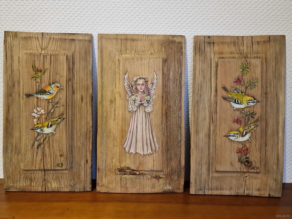Ангелочек с птицами,на старинной доске ,масло. Размер 36х19см.