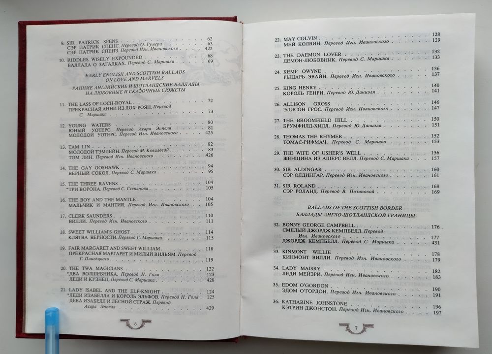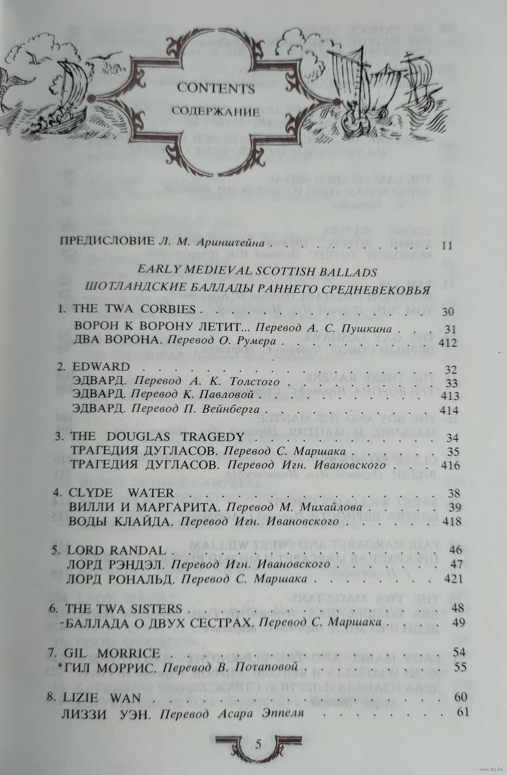 В сборник вошли лучшие образцы английских и шотландских баллад в переводах русских и советских поэтов и переводчиков: А.С. Пушкина, А.К. Толстого, К. Павловой, М. Цветаевой, Н. Гумилева, С.Я. Маршака, Игн. Ивановского и др.