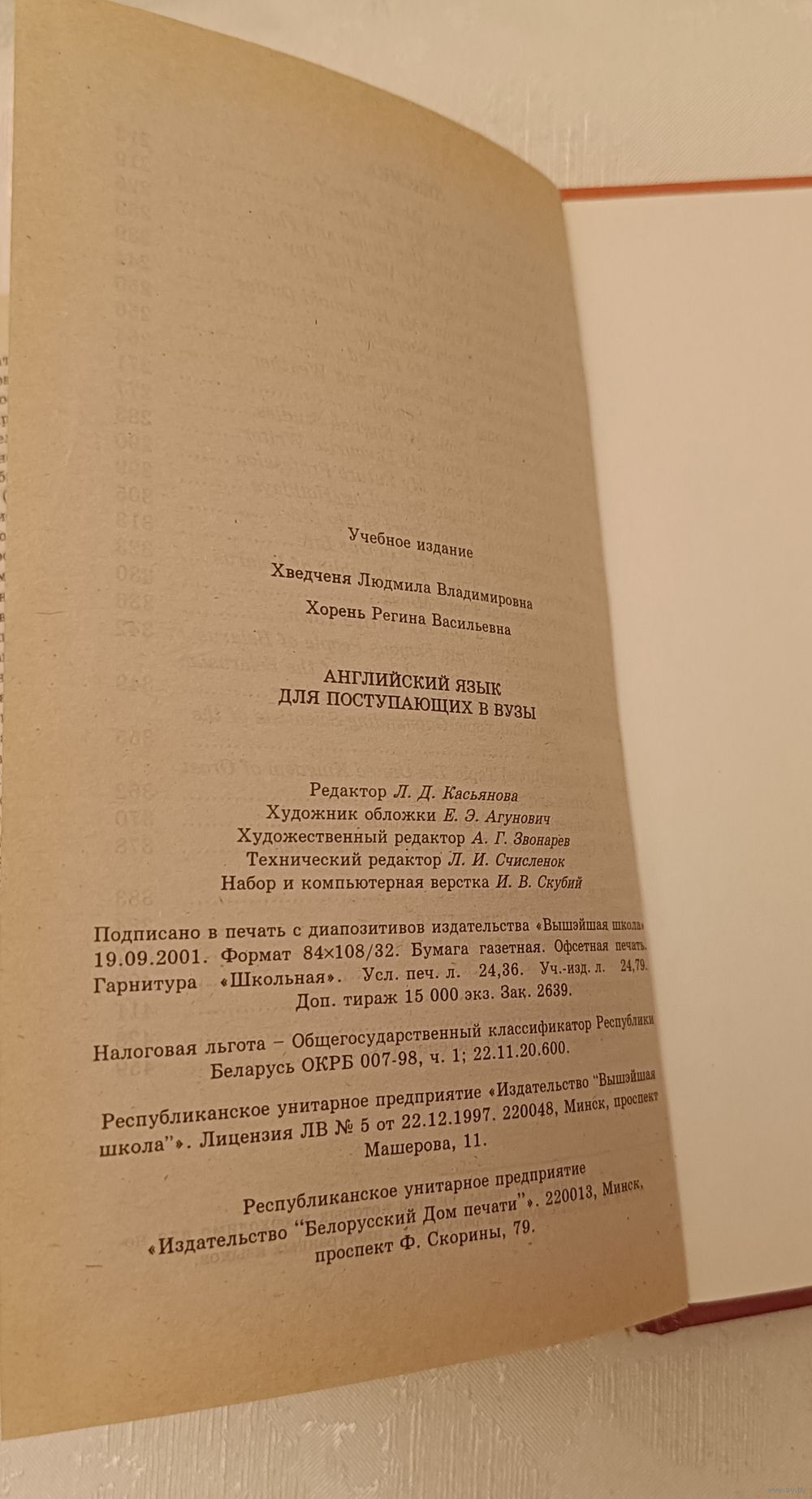 Хведченя Л. В. Английский язык для поступающих в вузы / Л. В. Хведченя, Р. В. Хорень. 14-е изд., доп.- Мн.: Выш. шк., 2001. 463 с.