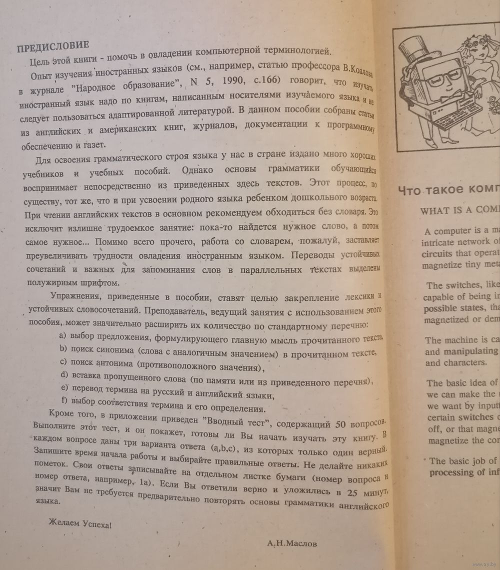 В данном учебно-справочном пособии приведены тексты по основным разделам вычислительной техники на английском и русском языках. Для программистов и пользователей компьютеров, желающих улучшить знание английского языка. Пособие может быть использовано самостоятельно, в ВУЗах и техникумах, в Учебных Центрах, Курсах повышения квалификации и других учебных заведениях.