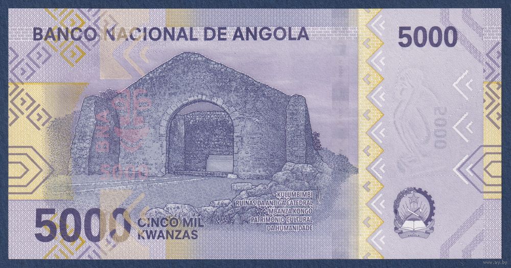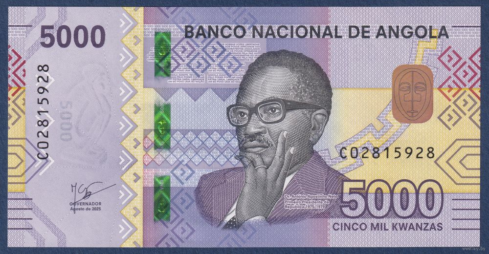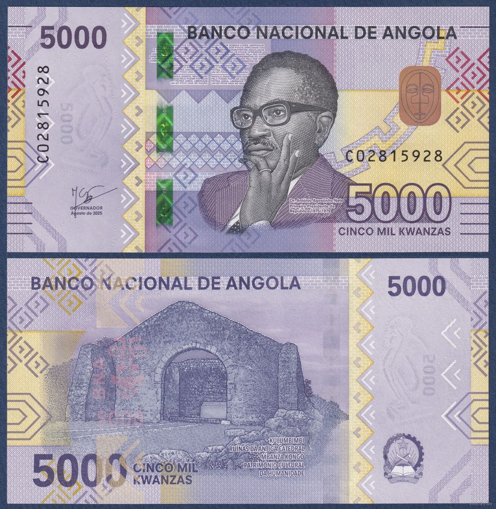 Ангола, 5000 кванза 2025 г, P-W164 (C, президент Антонио Нето, руины старого собора Кулумбимби), UNC