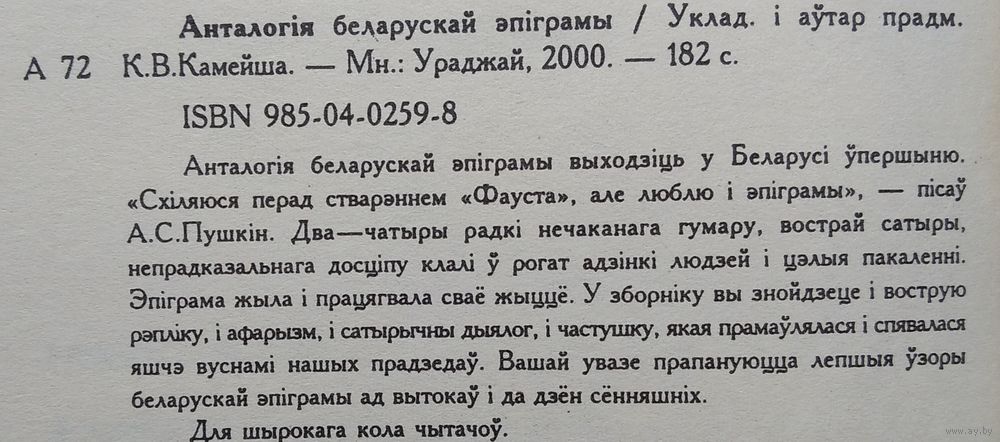 Анталогія беларускай эпіграмы. Укладальнік і аўтар прадмовы К. Камейша. Мінск. Ураджай, 2000 г. 180 с. Мяккая вокладка.