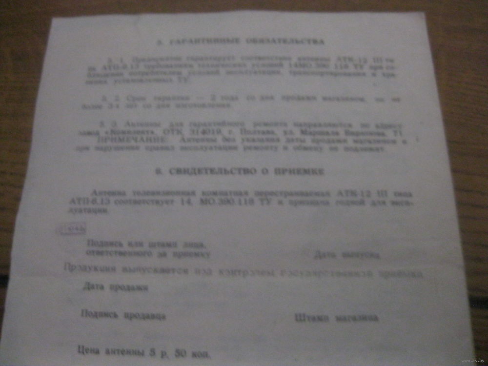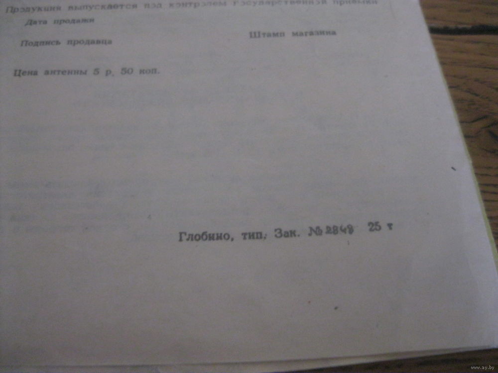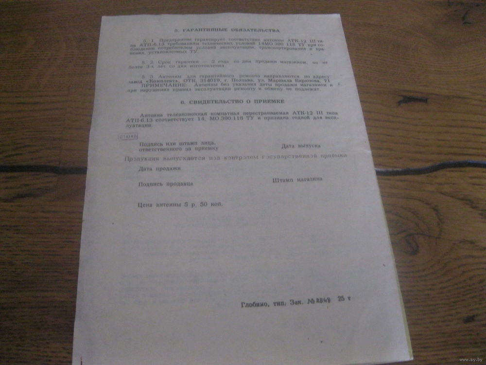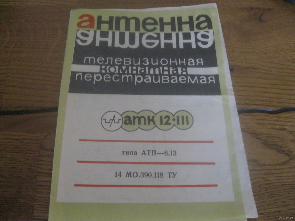 Антенна телевизионная комнатная *АТК-12 III продается только паспорт ,без антены(отсутствует) в хор.сост. без торга и обмена.Стоимость окончательная 7 р.. ПОЧТАМИ НЕ ОТПРАВЛЯЮ ВООБЩЕ.Только самовывоз г.Минск ул.П.Панченко !!!!!