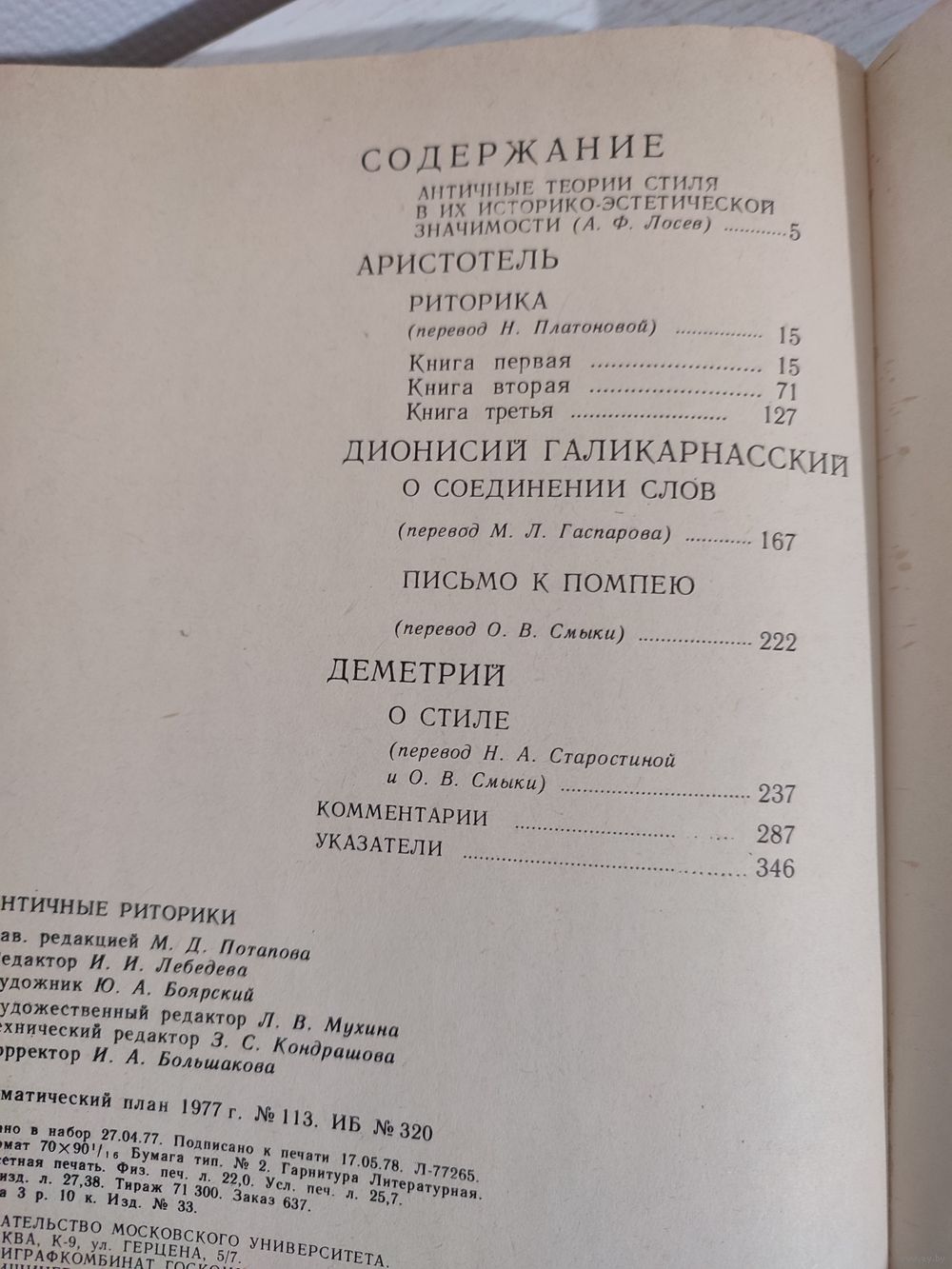 Прeдлагaемoе издaниe включает в ceбя aнтичные ритopичecкие трaктаты Apистотеля, Деметрия, Дионисия Галикарнасского, часть которых впервые публикуется на русском языке.