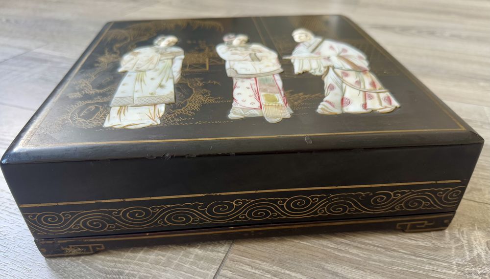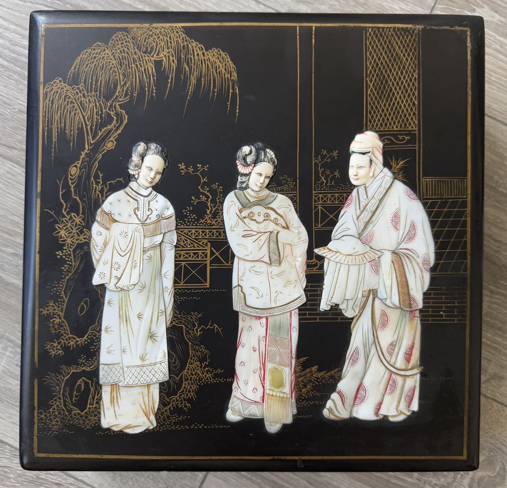 Большая Китайская шкатулка 1950х дерево,кость/перламутр, роспись. Состояние идеальное, подойдет для хранения ювелирных украшений, бижутерии. Размеры: 28/27/7 см.