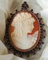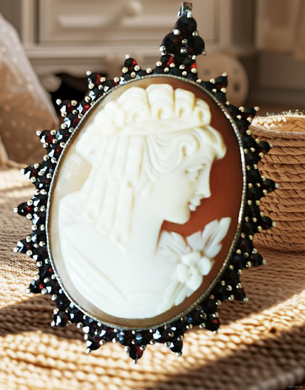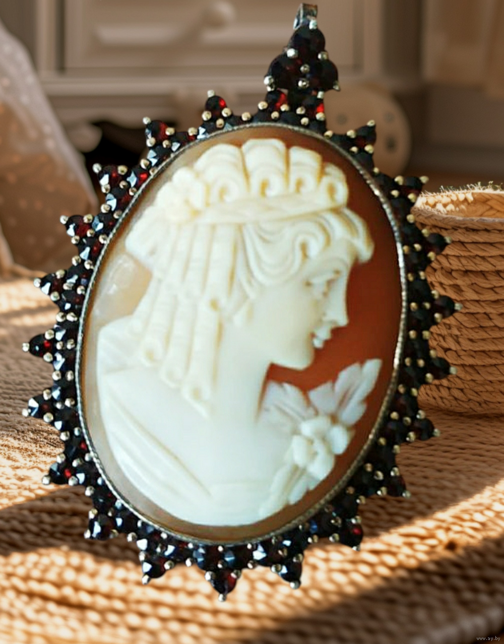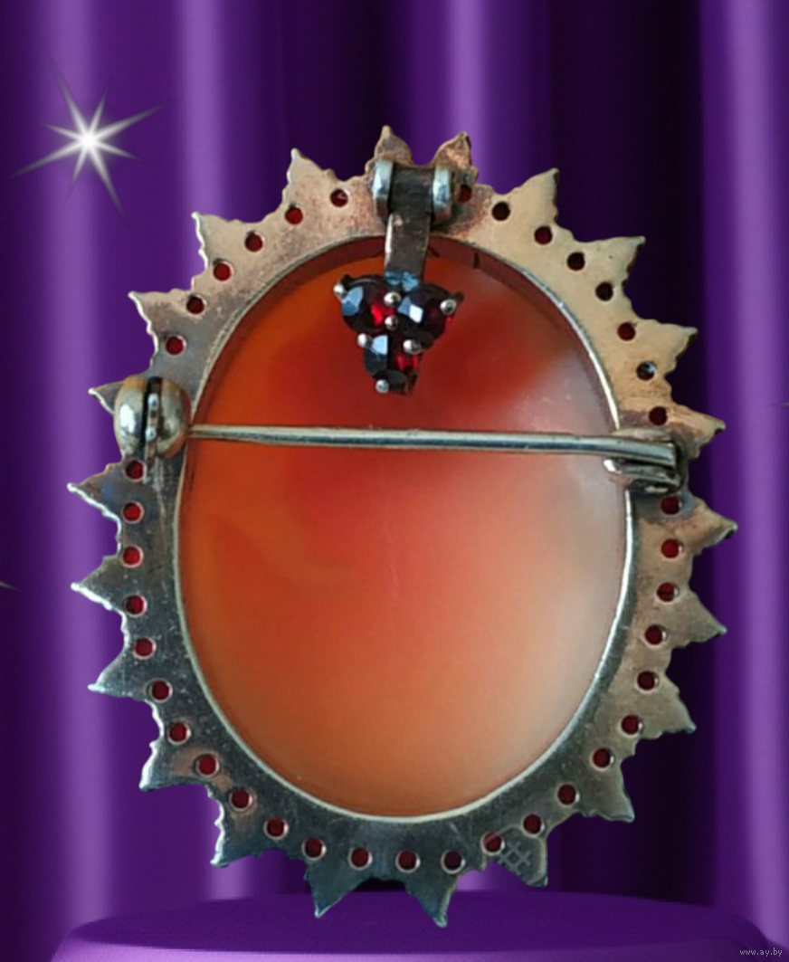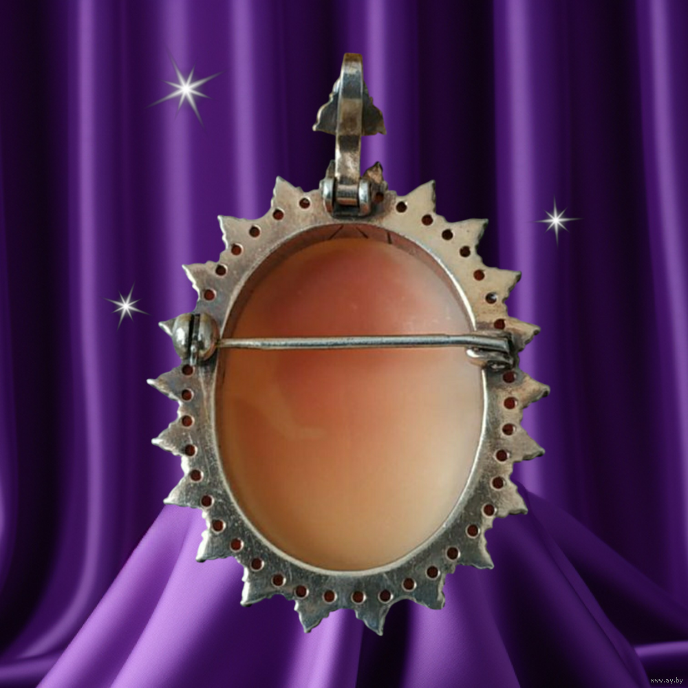 Редкостная,антикварная,конца 19 века брошь и одновременно подвеска из 900 серебра с глубоким золочением, ракушечной камеей в обрамлении Богемских кроваво- красных гранатов - ( пироп).Состояние,сохранность отличное ! На игле застежки проба 900. 69 граненых пиропов.