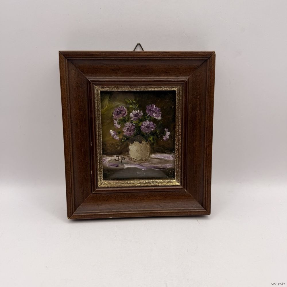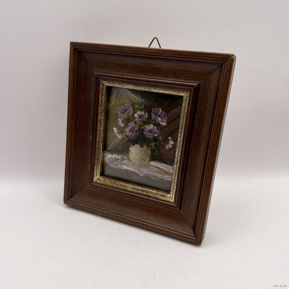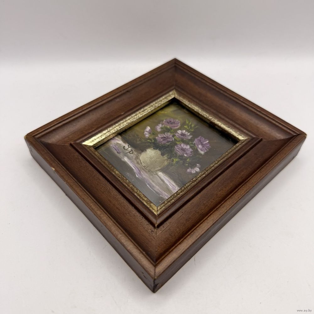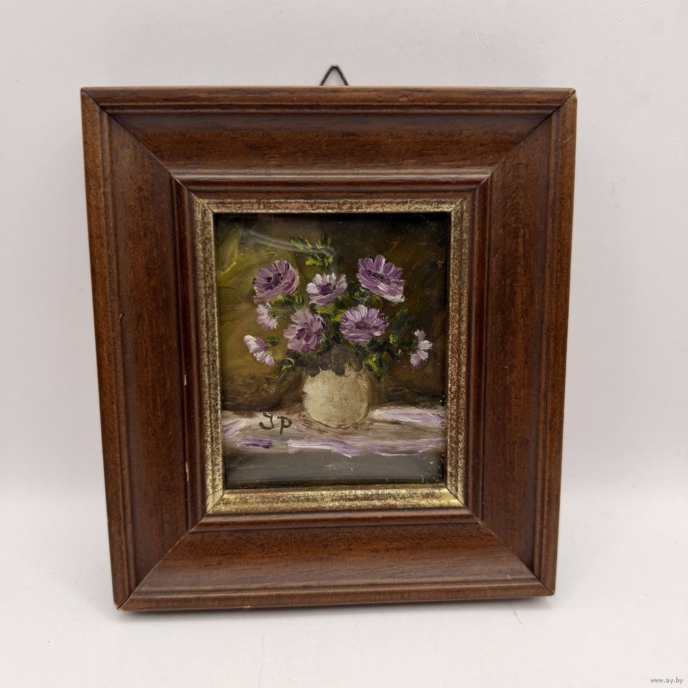 Антикварная картина маслом в деревянной раме ручной работы. Цветочный букет в вазе с подписью автора под моллированным (выгнутым) стеклом. Италия. 1950-е г.г. Размер 12 х 13,5 см. Подвес для настенного размещения.