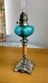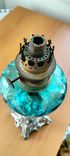 Богатое основание из литого цинка (никелирование) выполнено в стиле Art Nouveau (ар-нуво) с цветочным декором, типичное для того времени. Продолжает основание красивая красно-коричневая мраморная колонна и литая цинковая капитель. Кольцо горелки и горелка изготовлены из латуни. Стеклянная купель выполнена из синего, узорчатого стекла. Хорошее, красивое, возрастное состояние. Размеры : Основание 13 х 13 см, полная высота с колбой 59 см, без колбы 38,5 см. Диаметр стеклянной купели 13 см. В нижней части основания имеется надпись 154 Depose