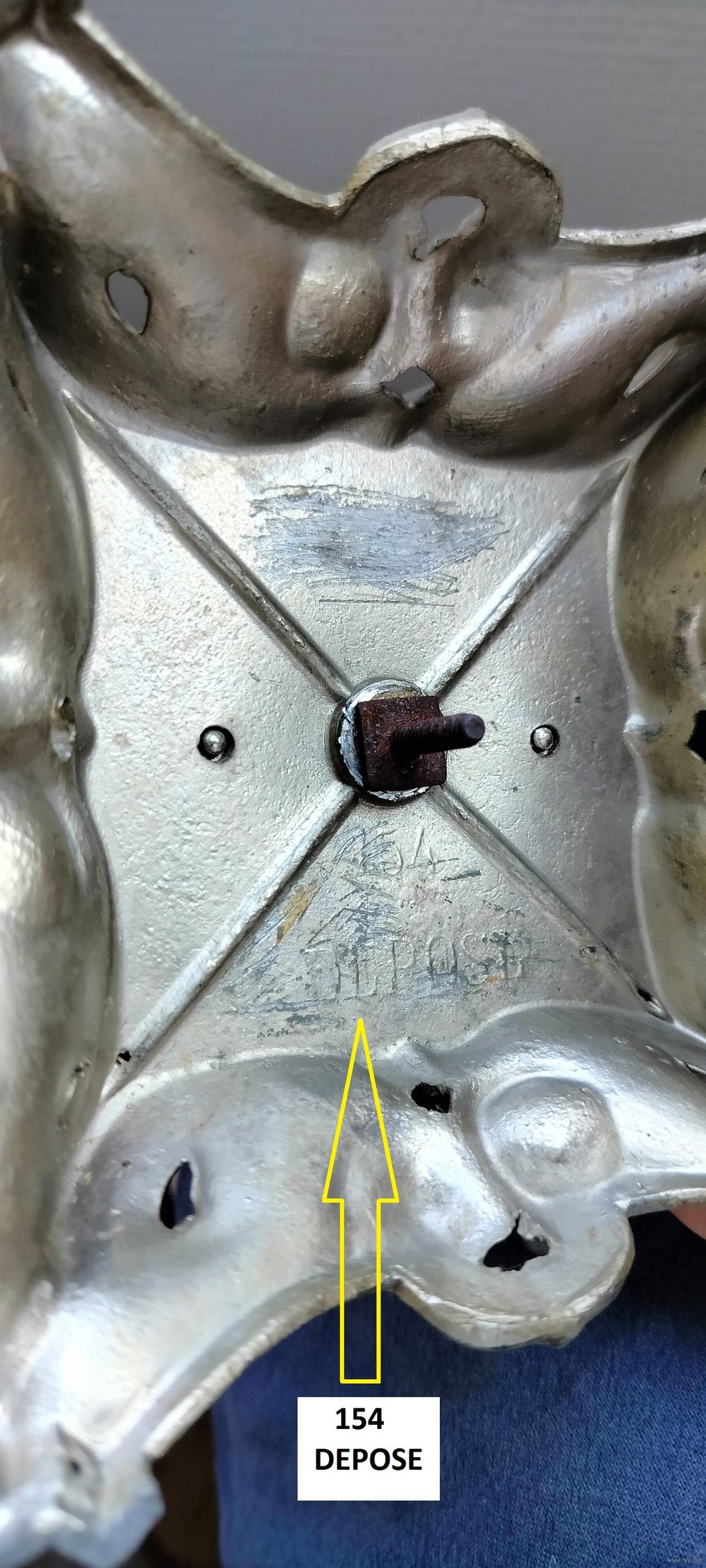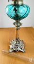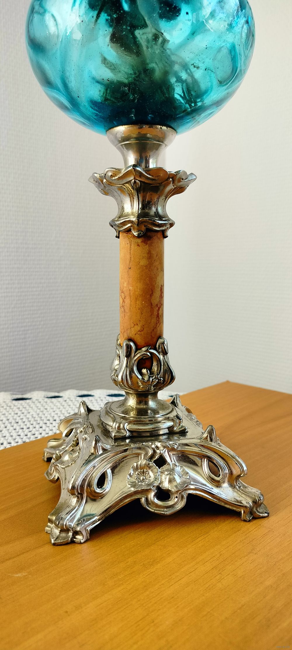 Богатое основание из литого цинка (никелирование) выполнено в стиле Art Nouveau (ар-нуво) с цветочным декором, типичное для того времени. Продолжает основание красивая красно-коричневая мраморная колонна и литая цинковая капитель. Кольцо горелки и горелка изготовлены из латуни. Стеклянная купель выполнена из синего, узорчатого стекла. Хорошее, красивое, возрастное состояние. Размеры : Основание 13 х 13 см, полная высота с колбой 59 см, без колбы 38,5 см. Диаметр стеклянной купели 13 см. В нижней части основания имеется надпись 154 Depose