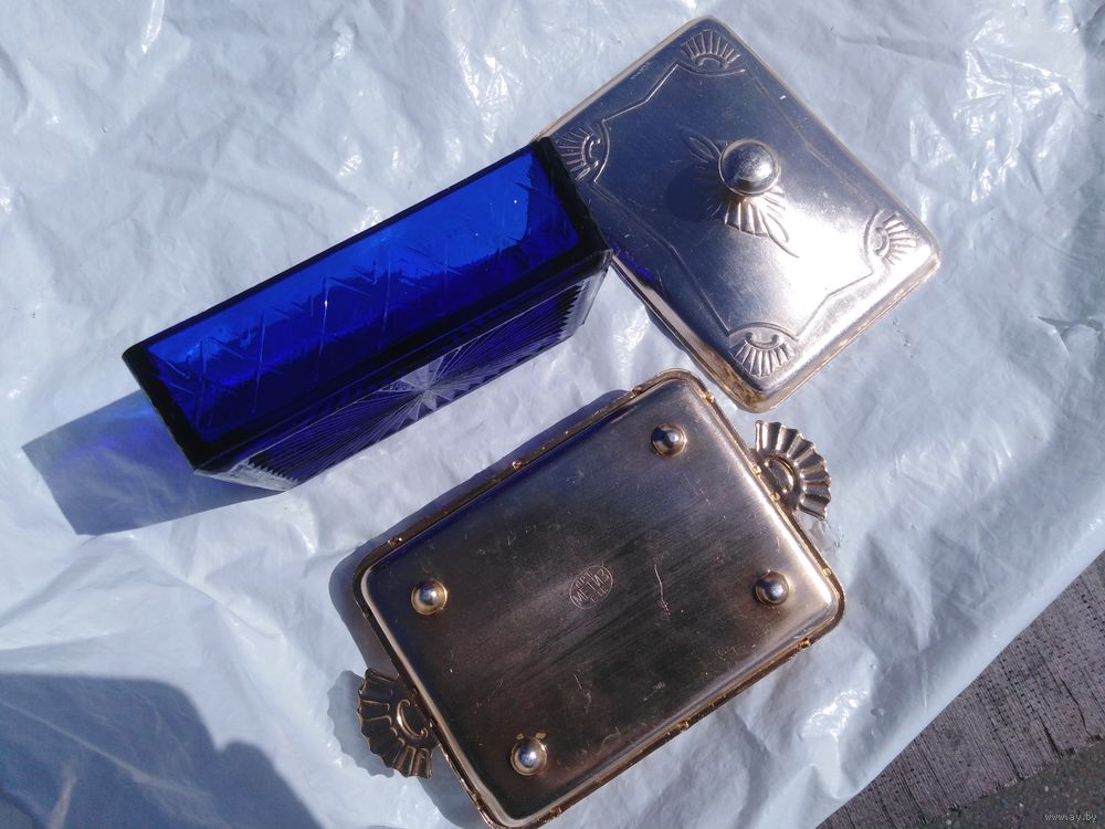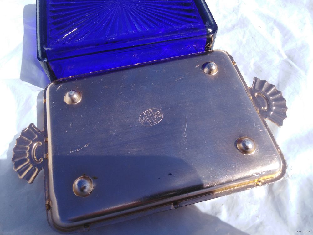 Металл лёгкий, золотого тона, стекло ручной работы, края колются, щербинки. Очень красивая вещица
