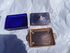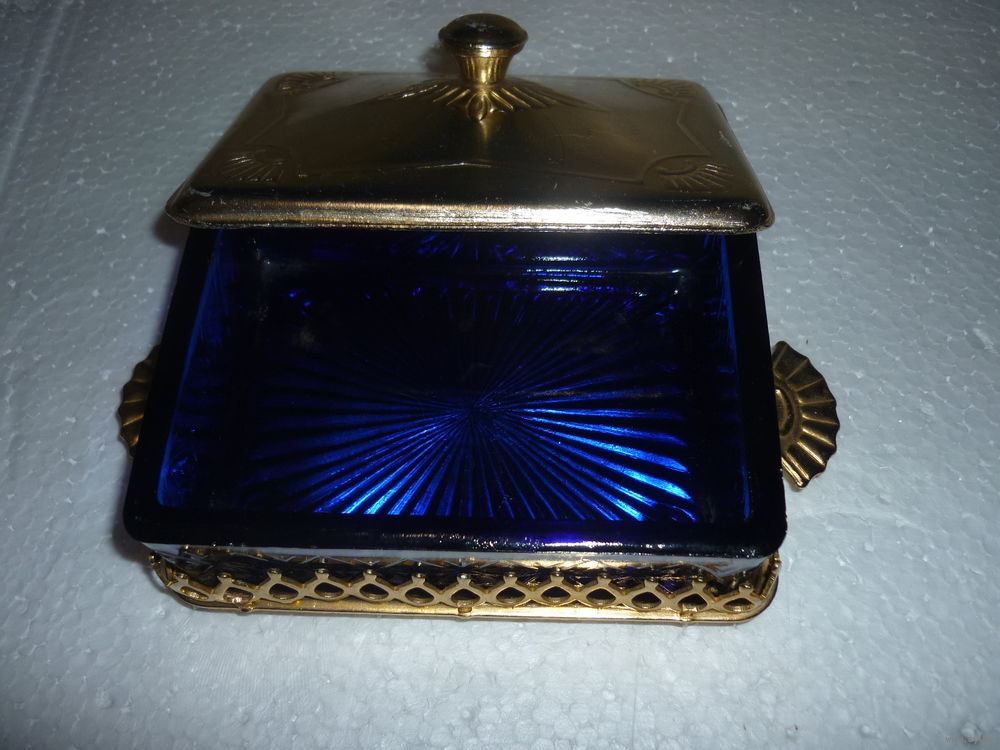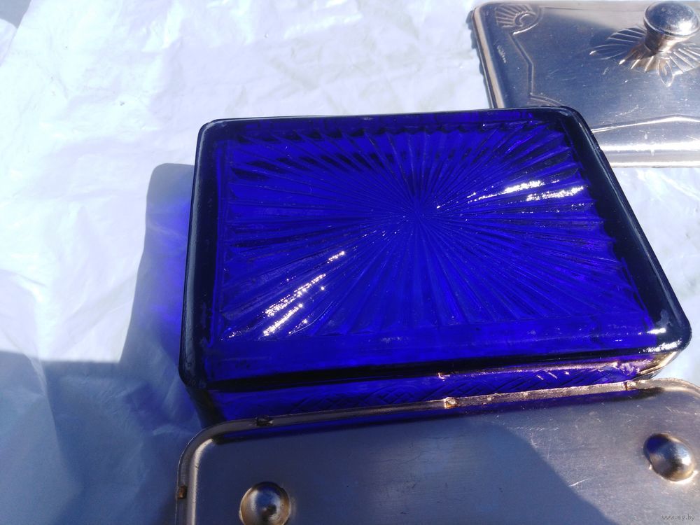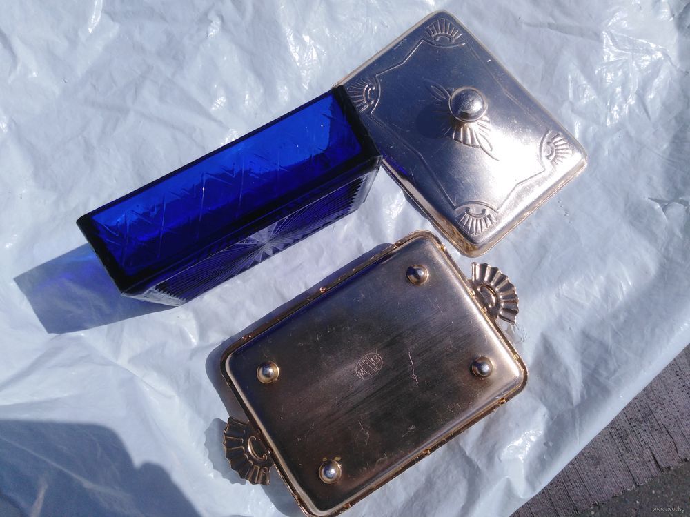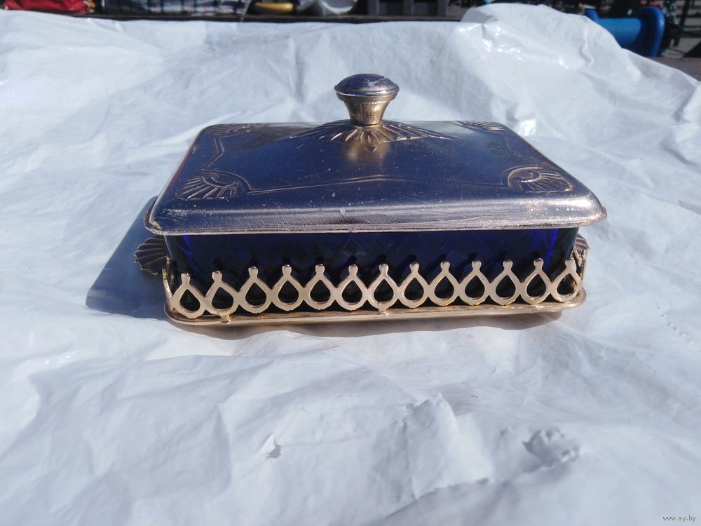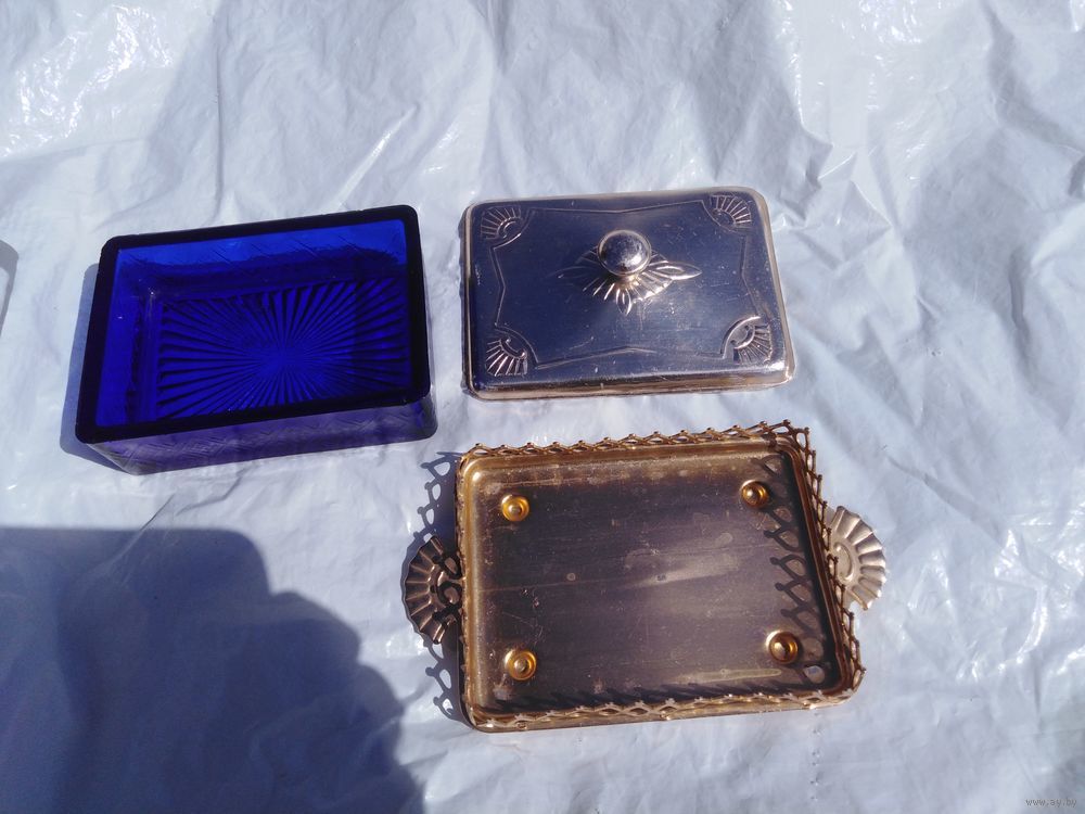Металл лёгкий, позолота, стекло ручной работы, края колются, щербинки. Очень красивая вещица