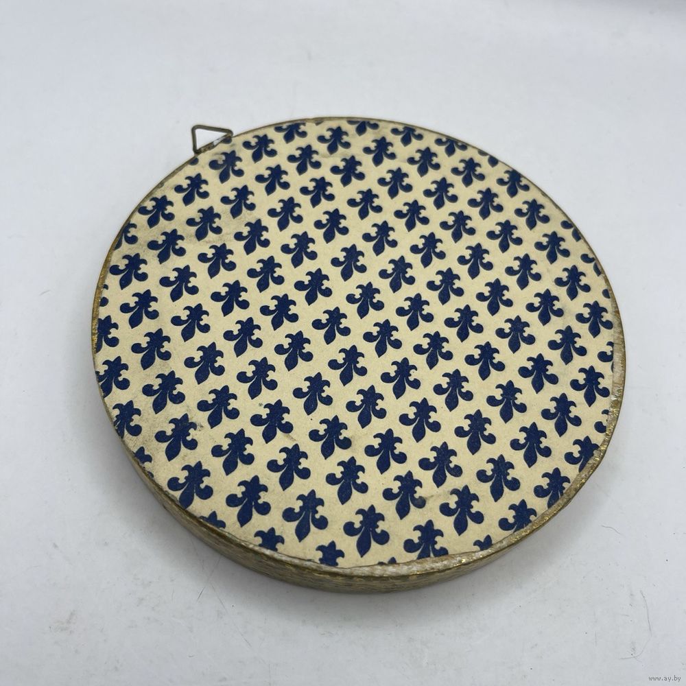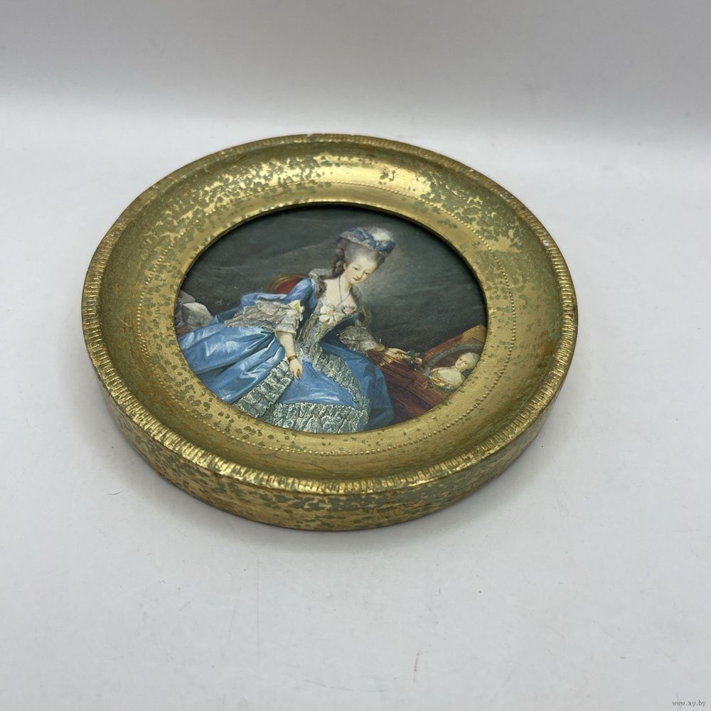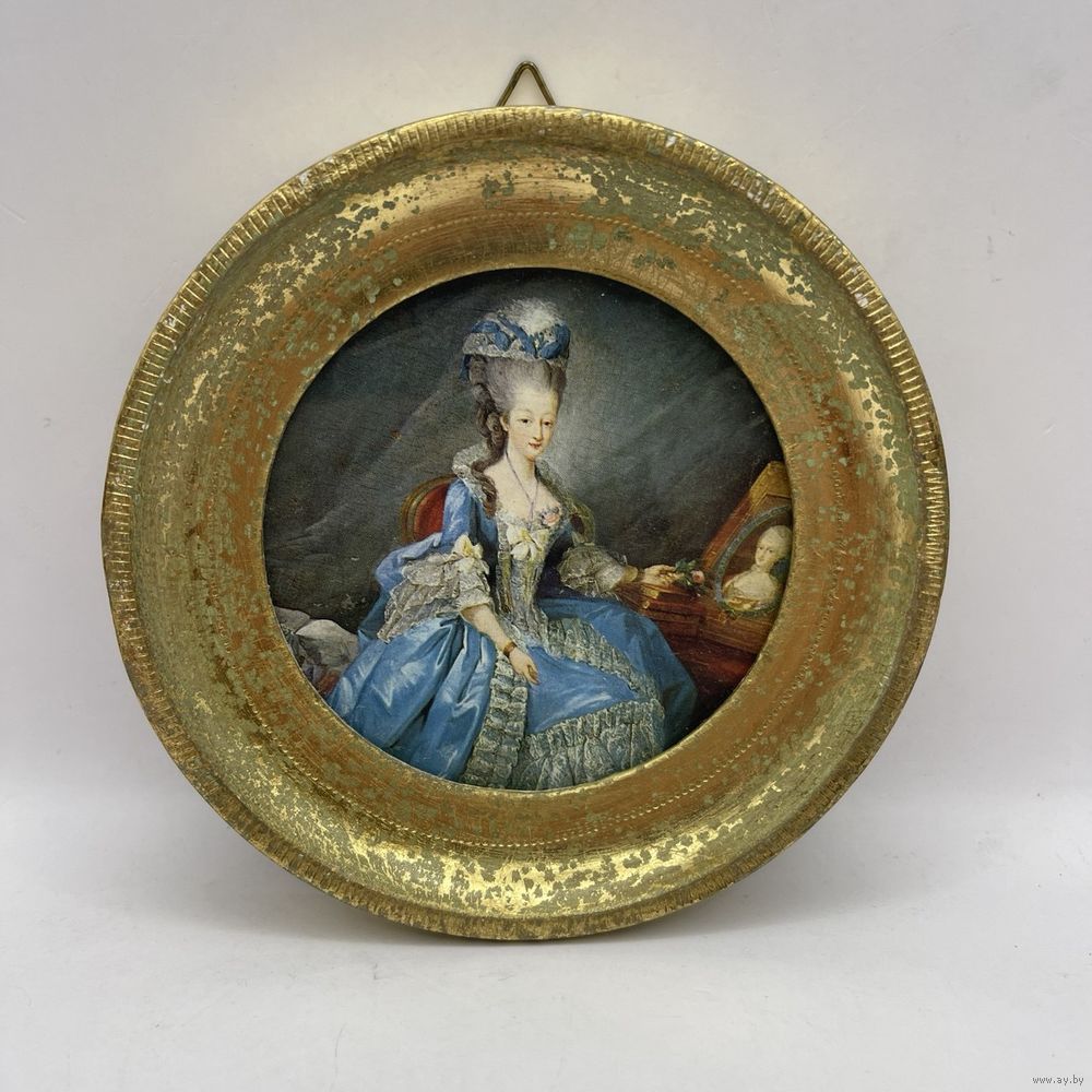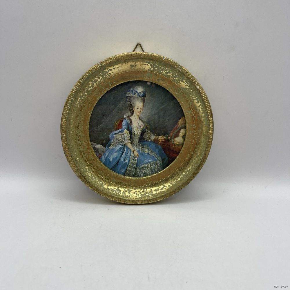 Антикварная репродукция в золоченой деревянной раме ручной работы со стеклом. Италия. 1950-е г.г. Диаметр 12,5 см. Подвес для настенного размещения. Следы времени на рамке (см. фото).