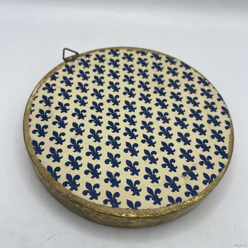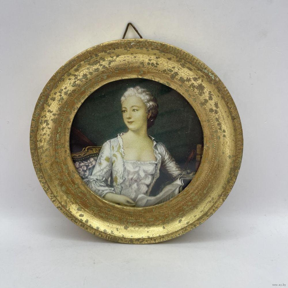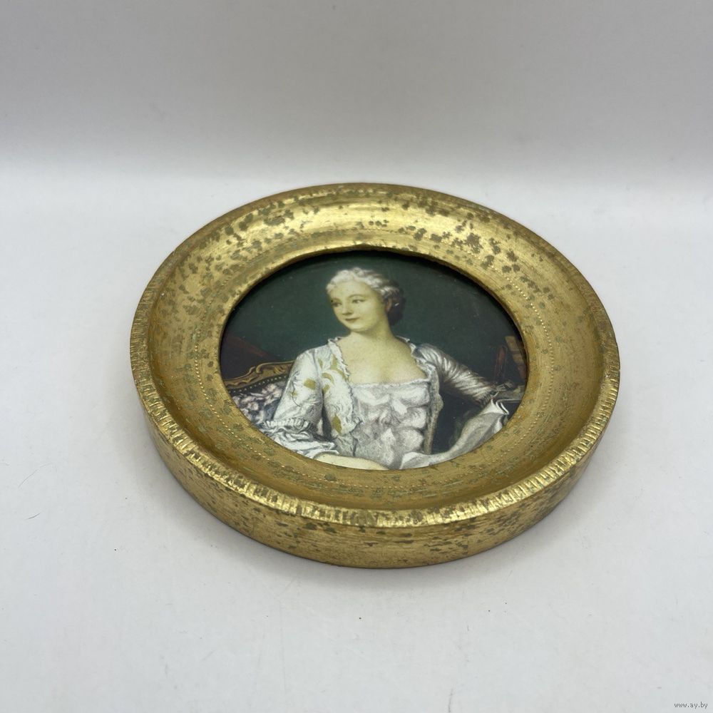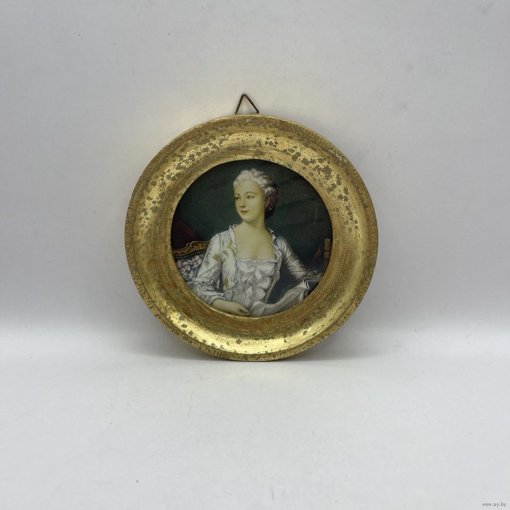 Антикварная репродукция в золоченой деревянной раме ручной работы со стеклом. Италия. 1950-е г.г. Диаметр 12,5 см. Подвес для настенного размещения. Следы времени на рамке (см. фото).