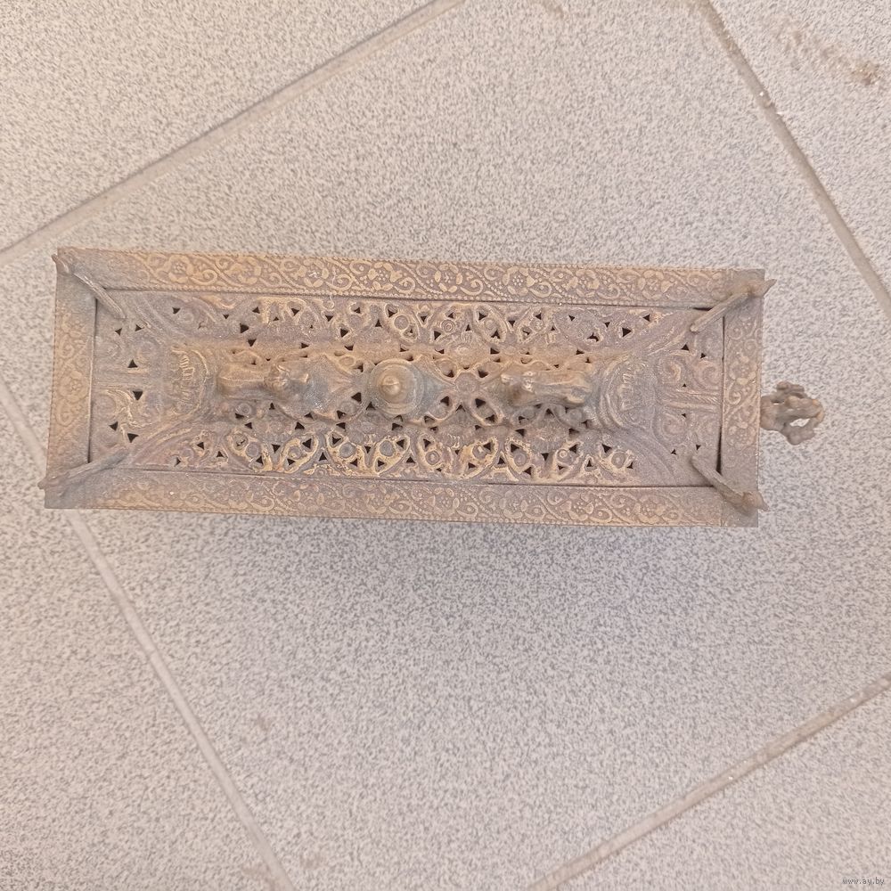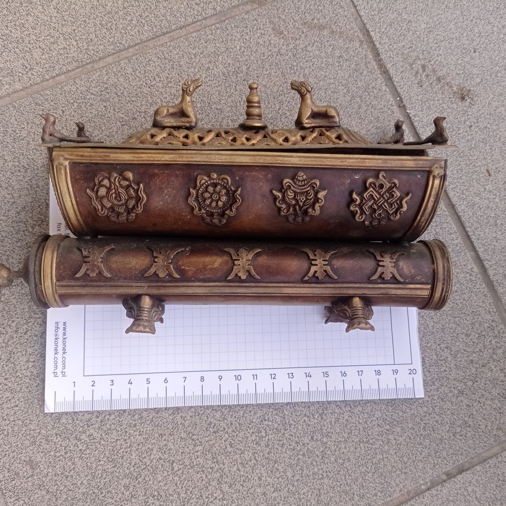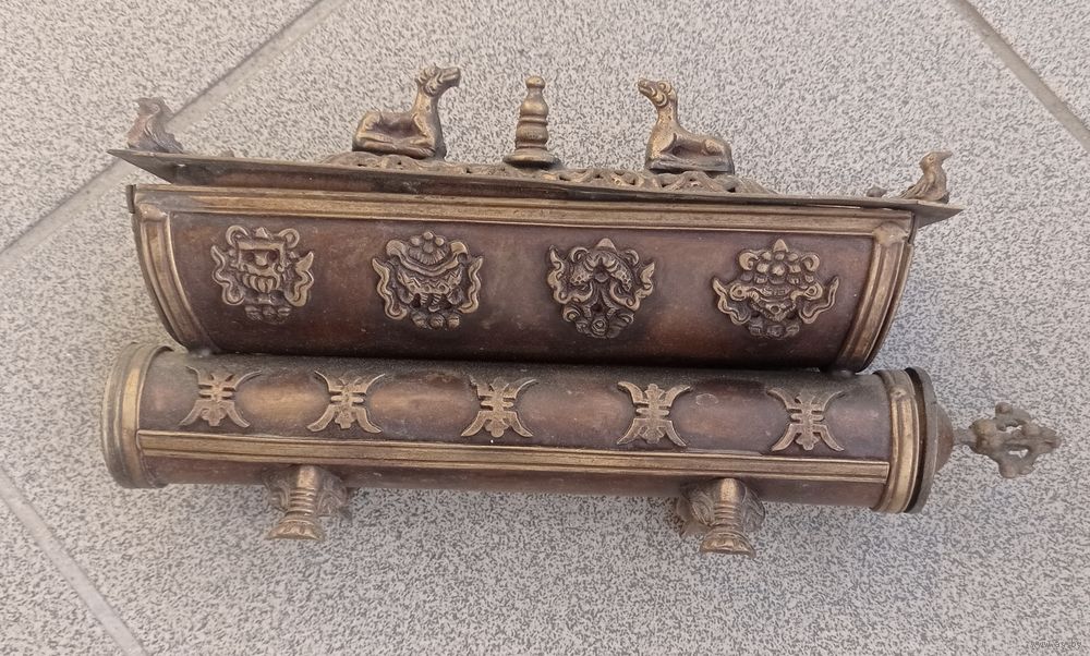 На крышке: Два оленя и центральный элемент (ступа или Дхармачакра) — это прямая отсылка к первой проповеди Будды. Считается, что даже животные вышли послушать его учение.