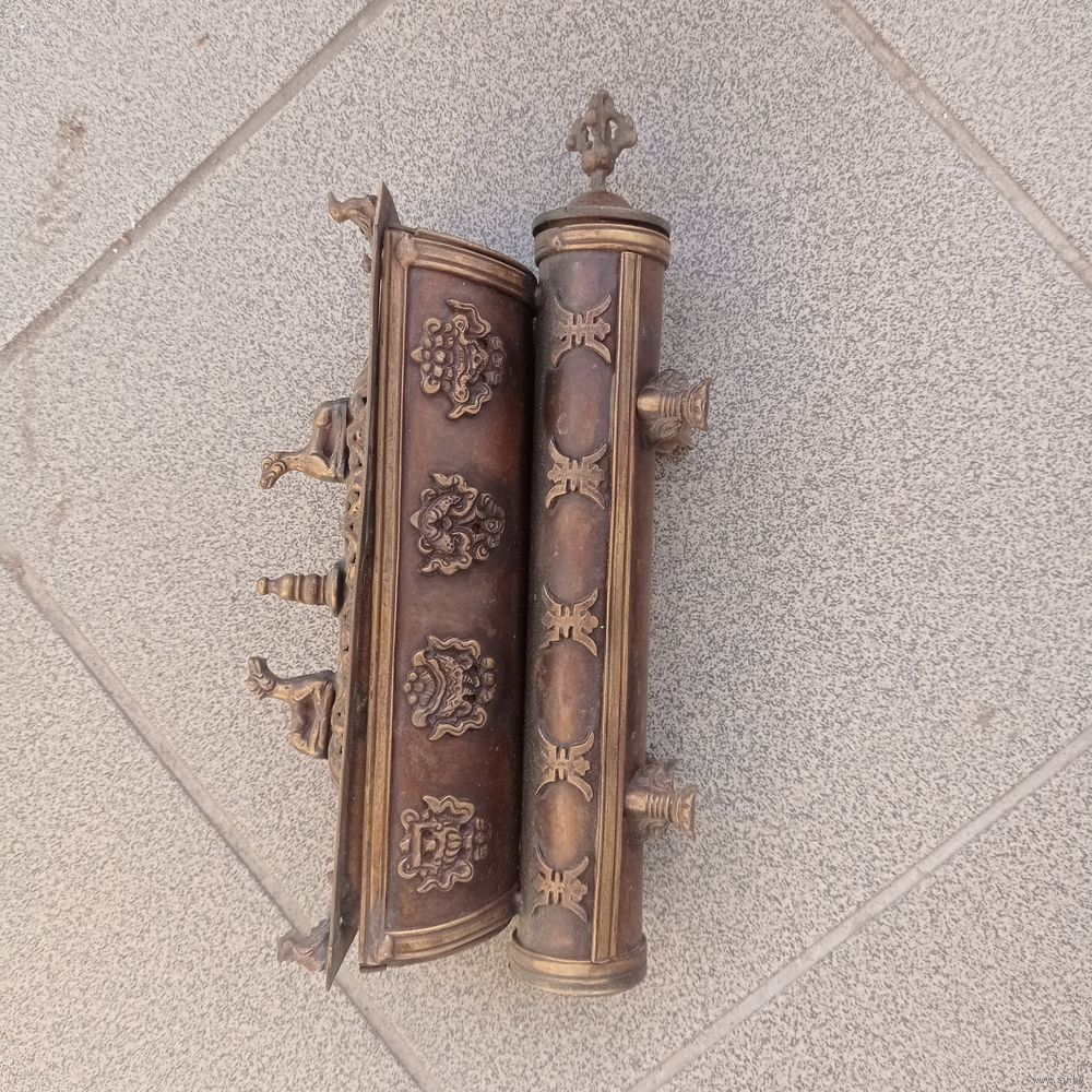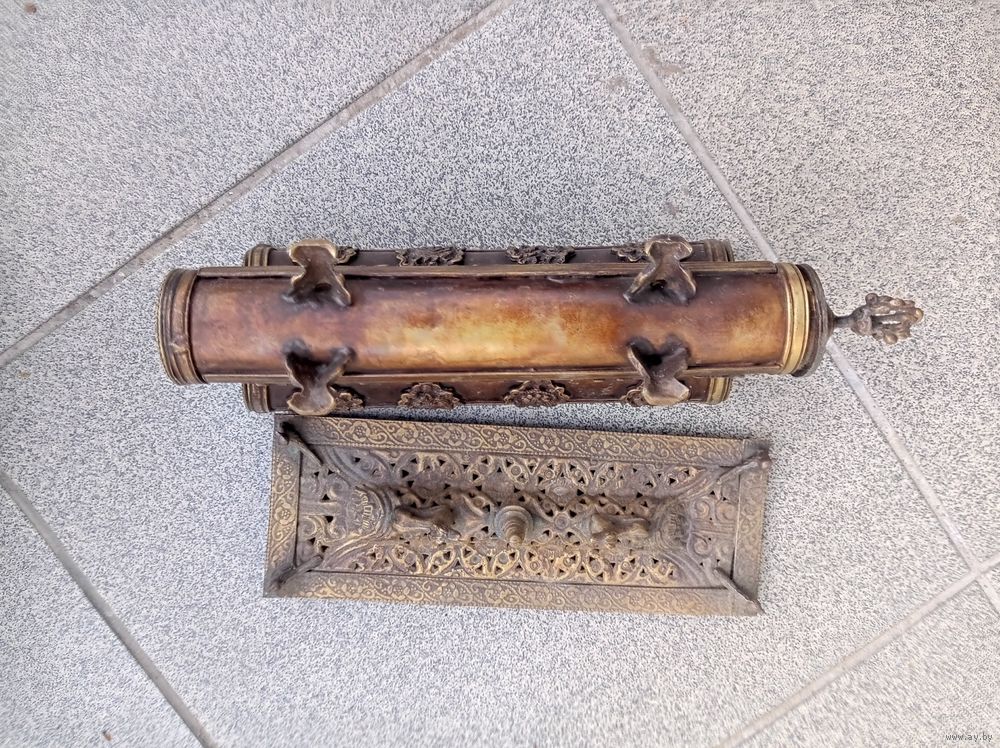 На нижнем цилиндре: Повторяющийся символ, напоминающий знак «Шо» или стилизованную мантру, которая служит для защиты и гармонизации пространства.