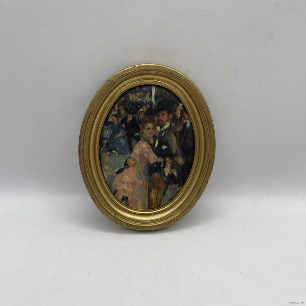 Антикварная шелкография в овальной раме, шелковая репродукция картины Пьера Огюста Ренуара «Бал в Мулен де ла Галетт». Франция. 1950-е г.г. Размер 9,5 х 12 см. Подвес для настенного размещения. Рамка со следами времени. Незначительная деформация шелка, на внешний вид не влияет (см. фото).