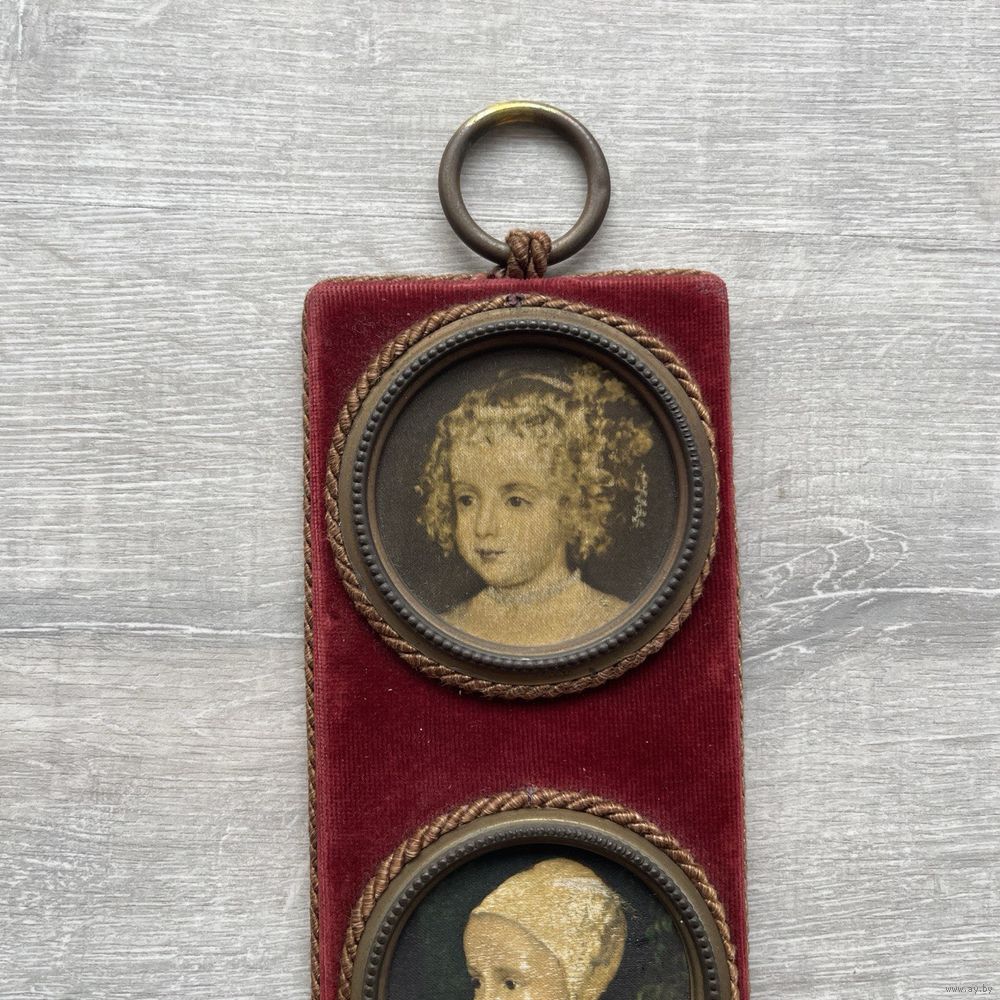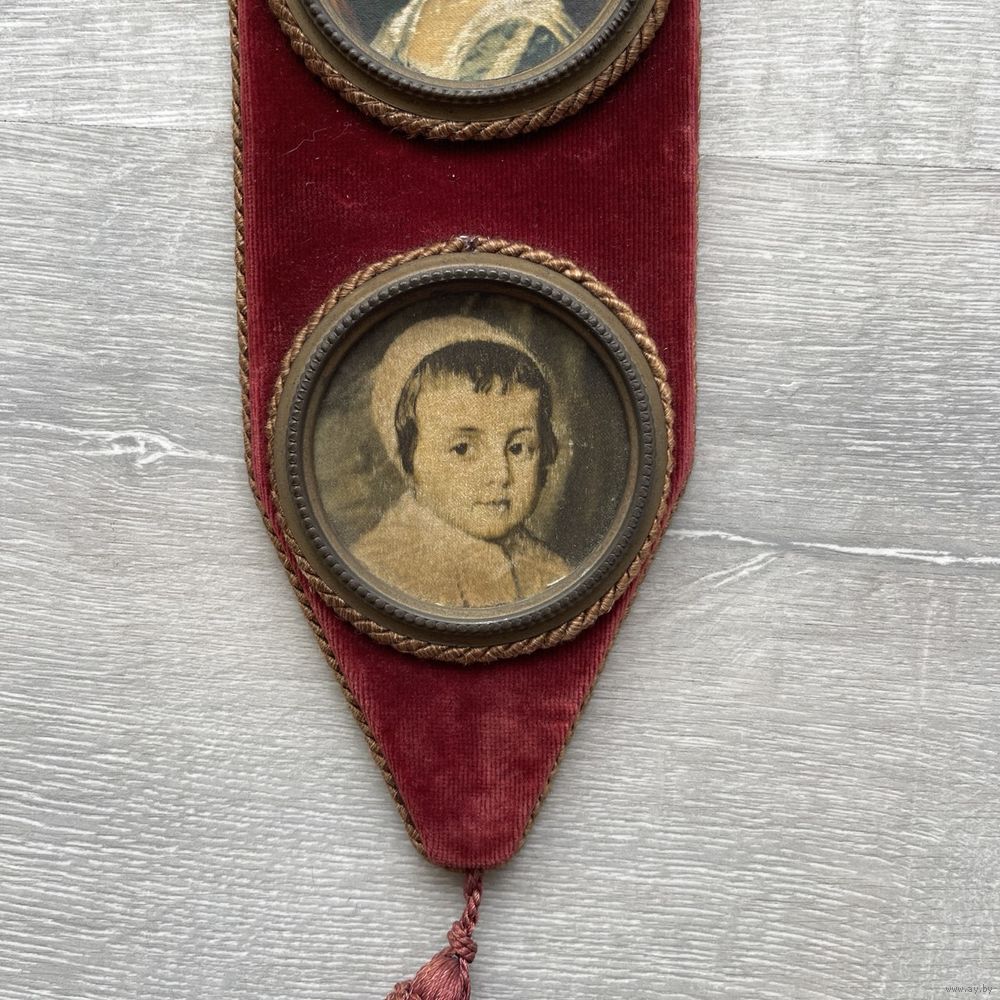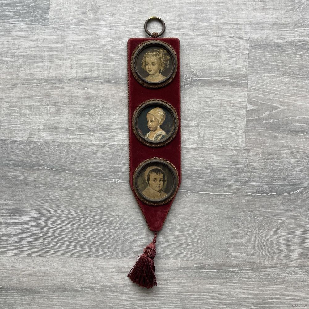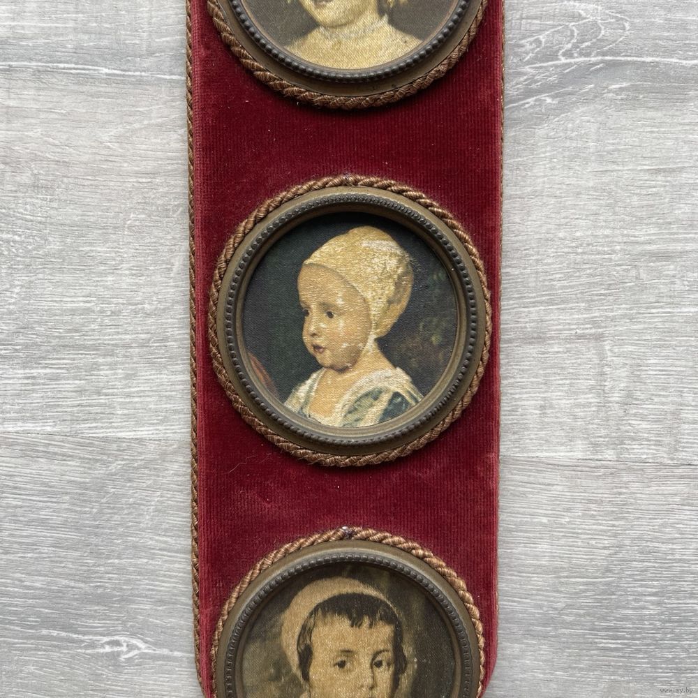 Антикварное панно в викторианском стиле с шелковыми портретными миниатюрами на благородном бордовом бархате. Италия. 1930-е г.г. Со стикером художественной мастерской. С кольцом-подвесом. Размер 8,5 х 46 см (высота кольцо-кисть). Диаметр шелкографий 7,5 см. Шелкографии со следами времени (см. фото).