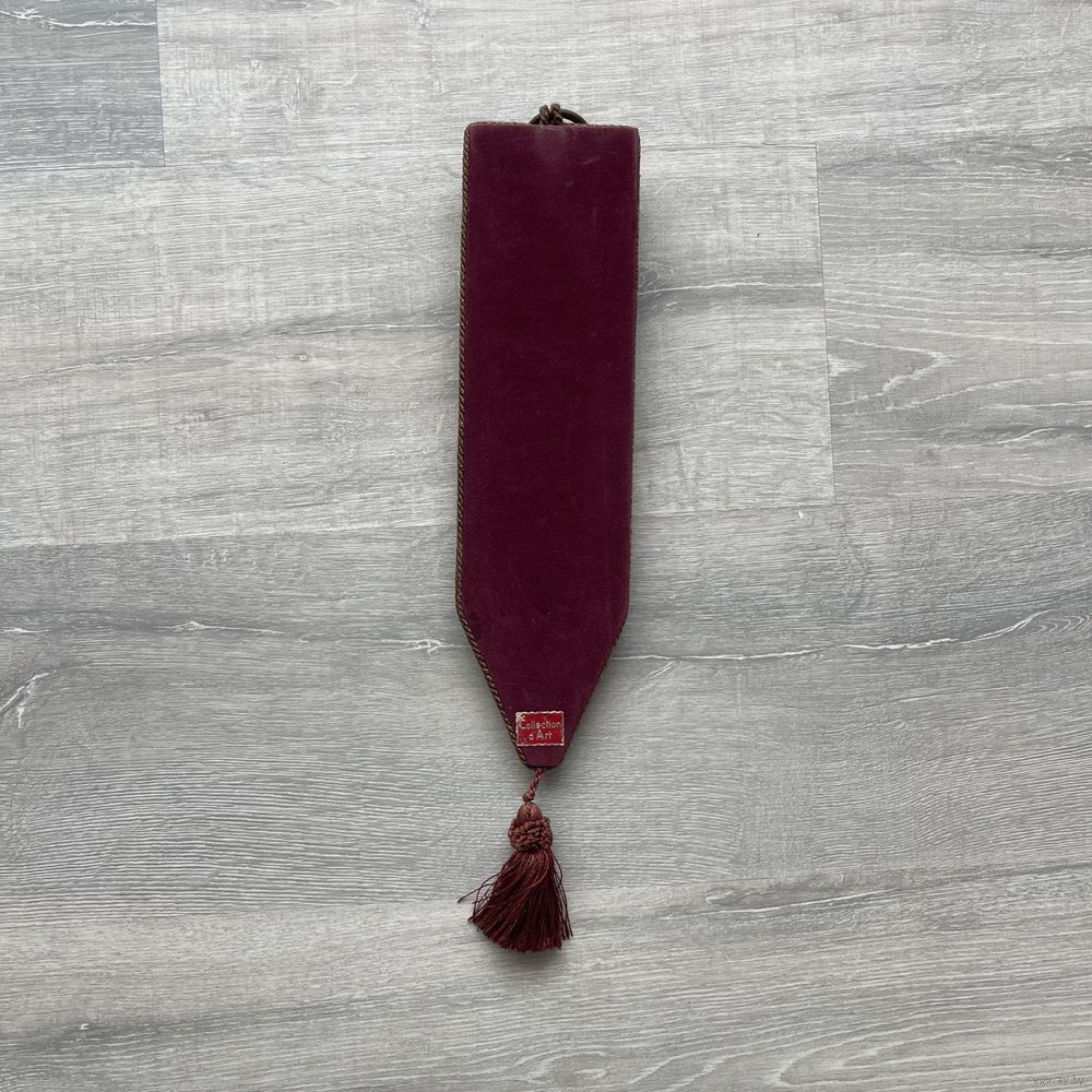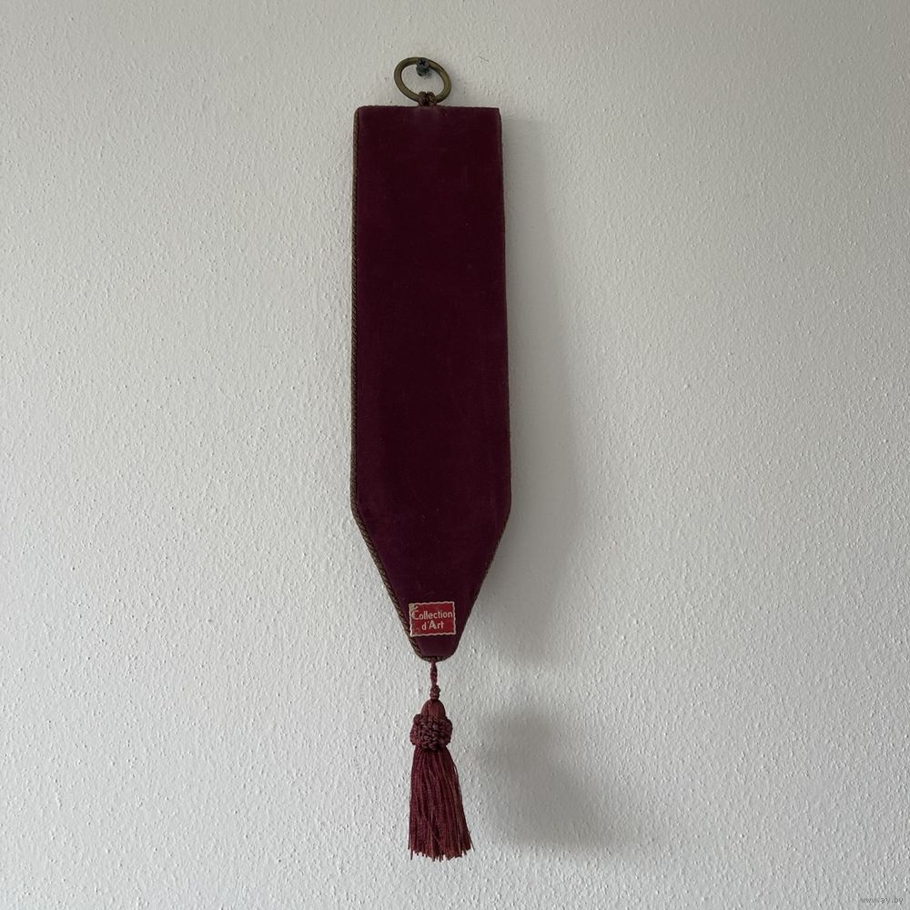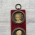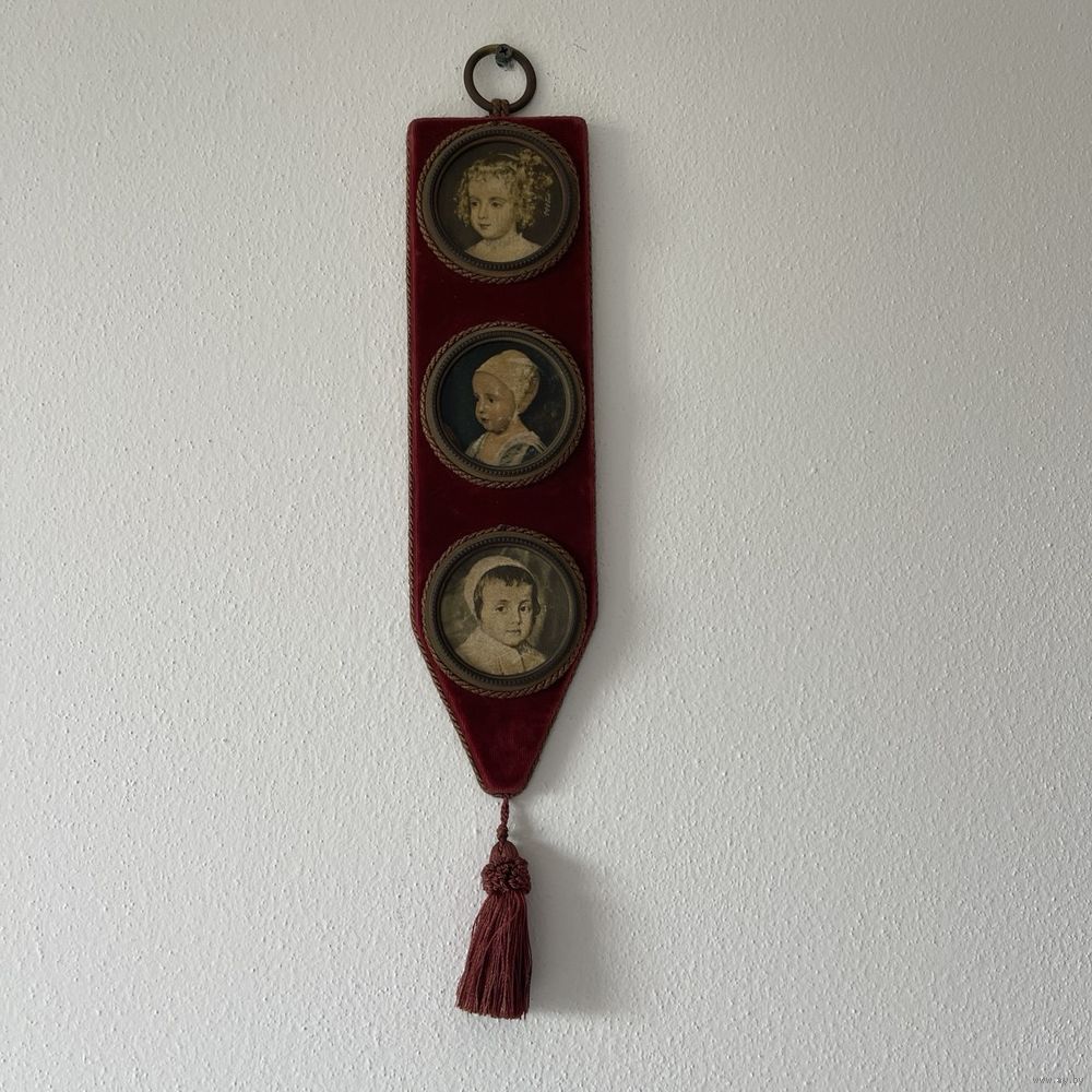 Антикварное панно в викторианском стиле с шелковыми портретными миниатюрами на благородном бордовом бархате. Италия. 1930-е г.г. Со стикером художественной мастерской. С кольцом-подвесом. Размер 8,5 х 46 см (высота кольцо-кисть). Диаметр шелкографий 7,5 см. Шелкографии со следами времени (см. фото).