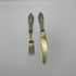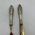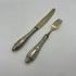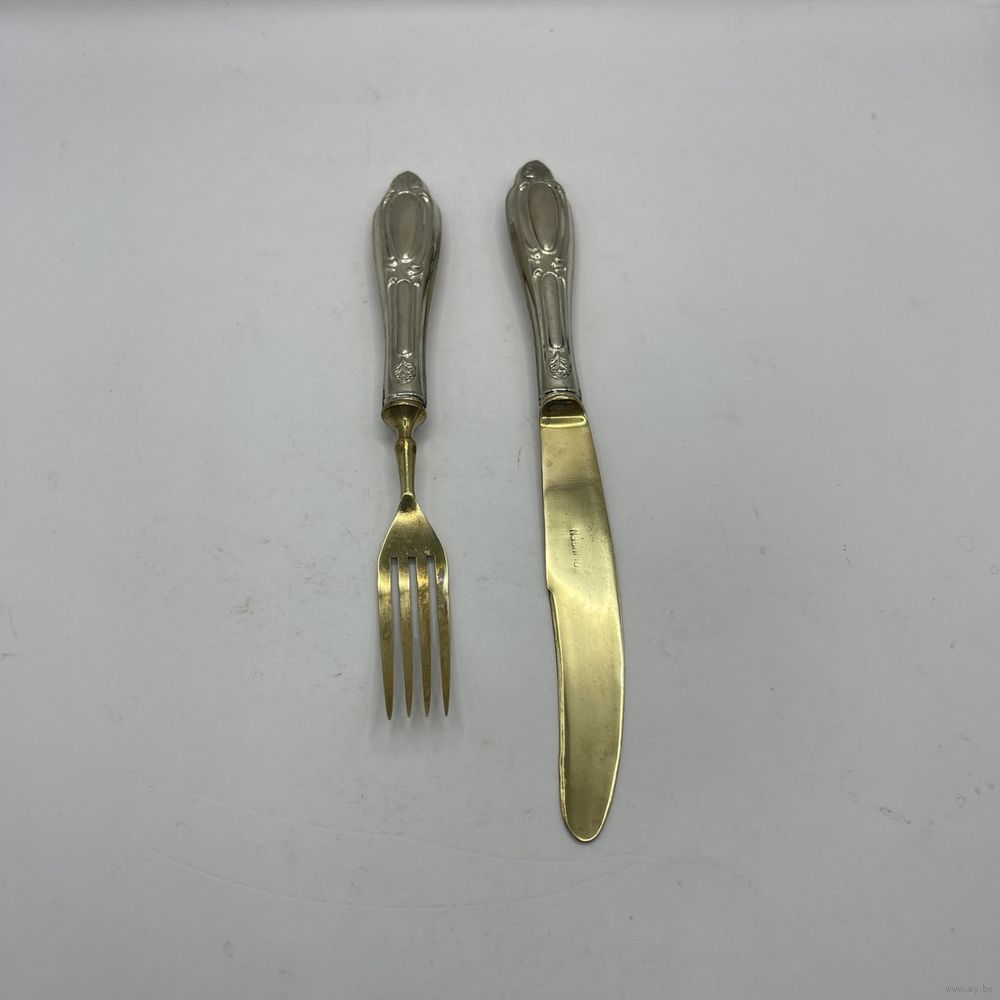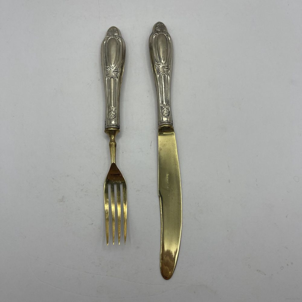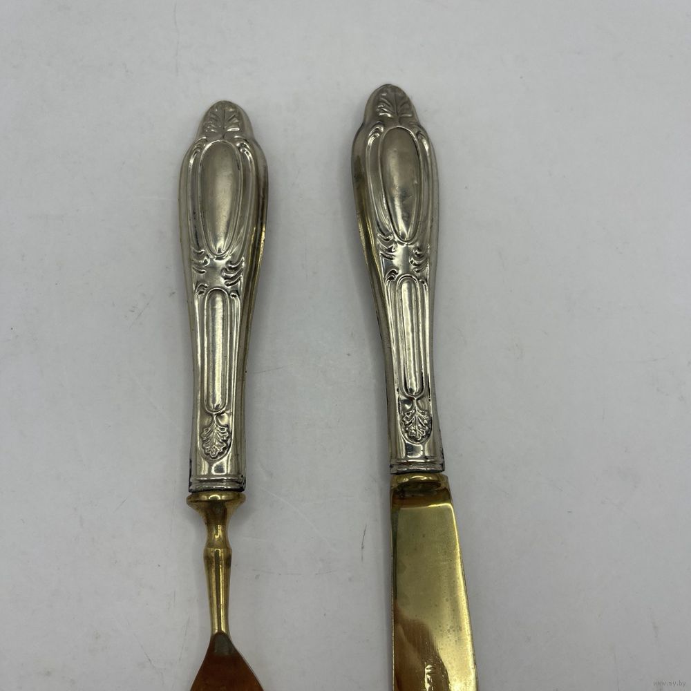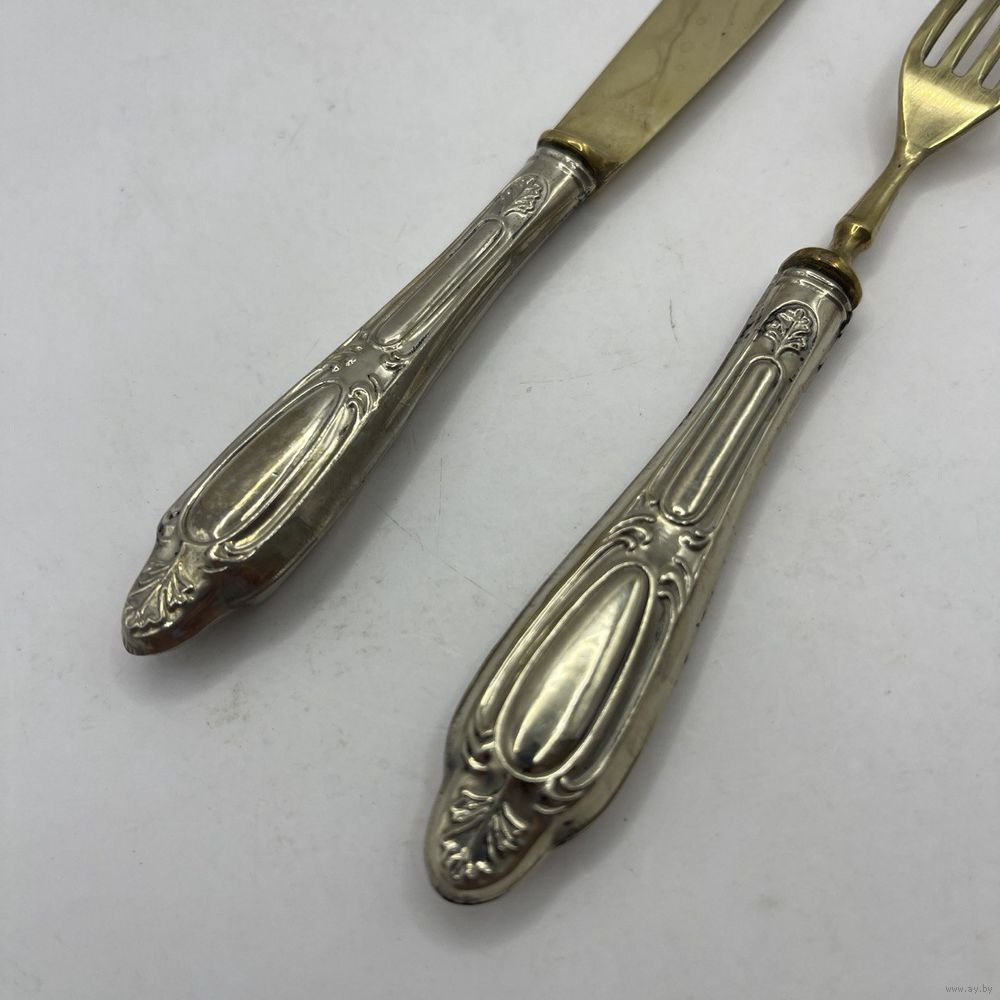 Антикварные десертные приборы, нож и вилка из стали Solingen с позолотой. Рельефные ручки из тисненого металла с глубоким серебрением. Германия. Клеймо Solingen на ноже. 1950-е г.г. Длина ножа 19,5 см, длина вилки 17 см. Естественная патина, следы времени (см. фото).