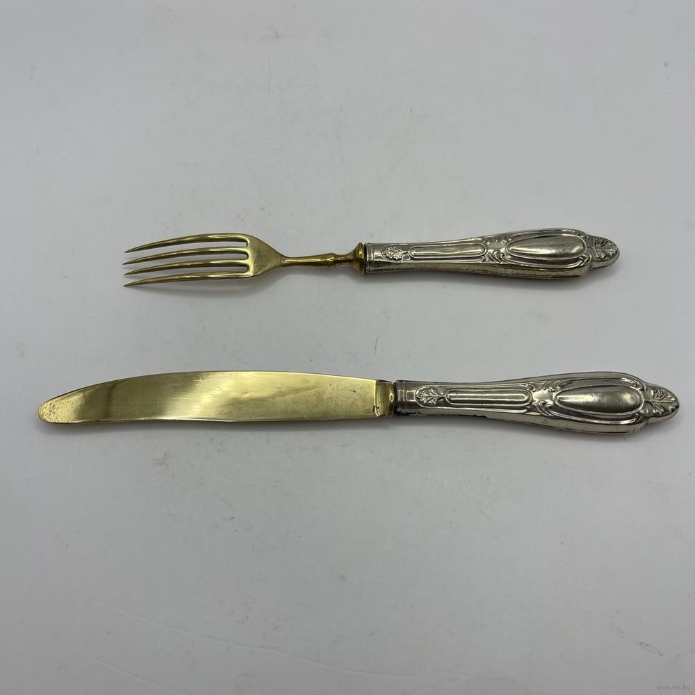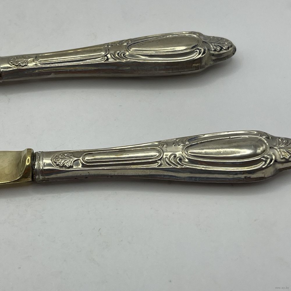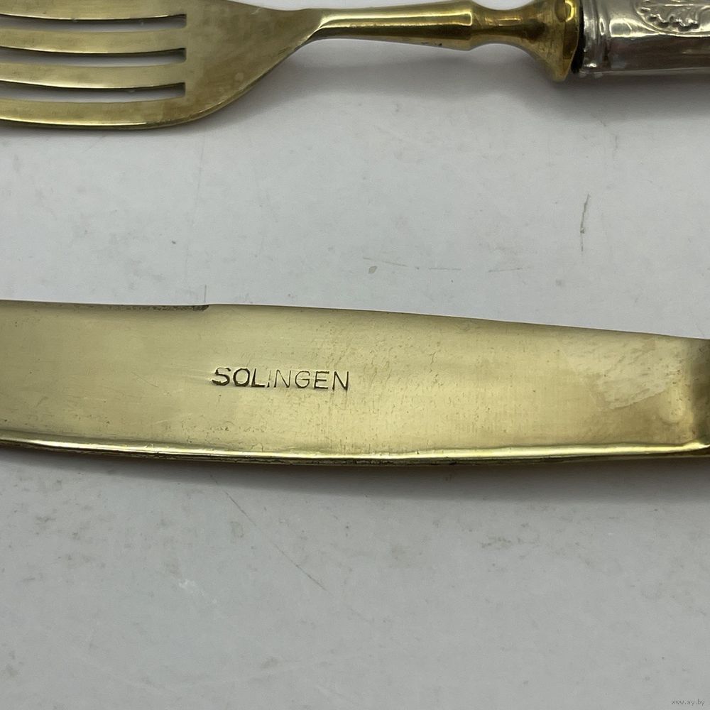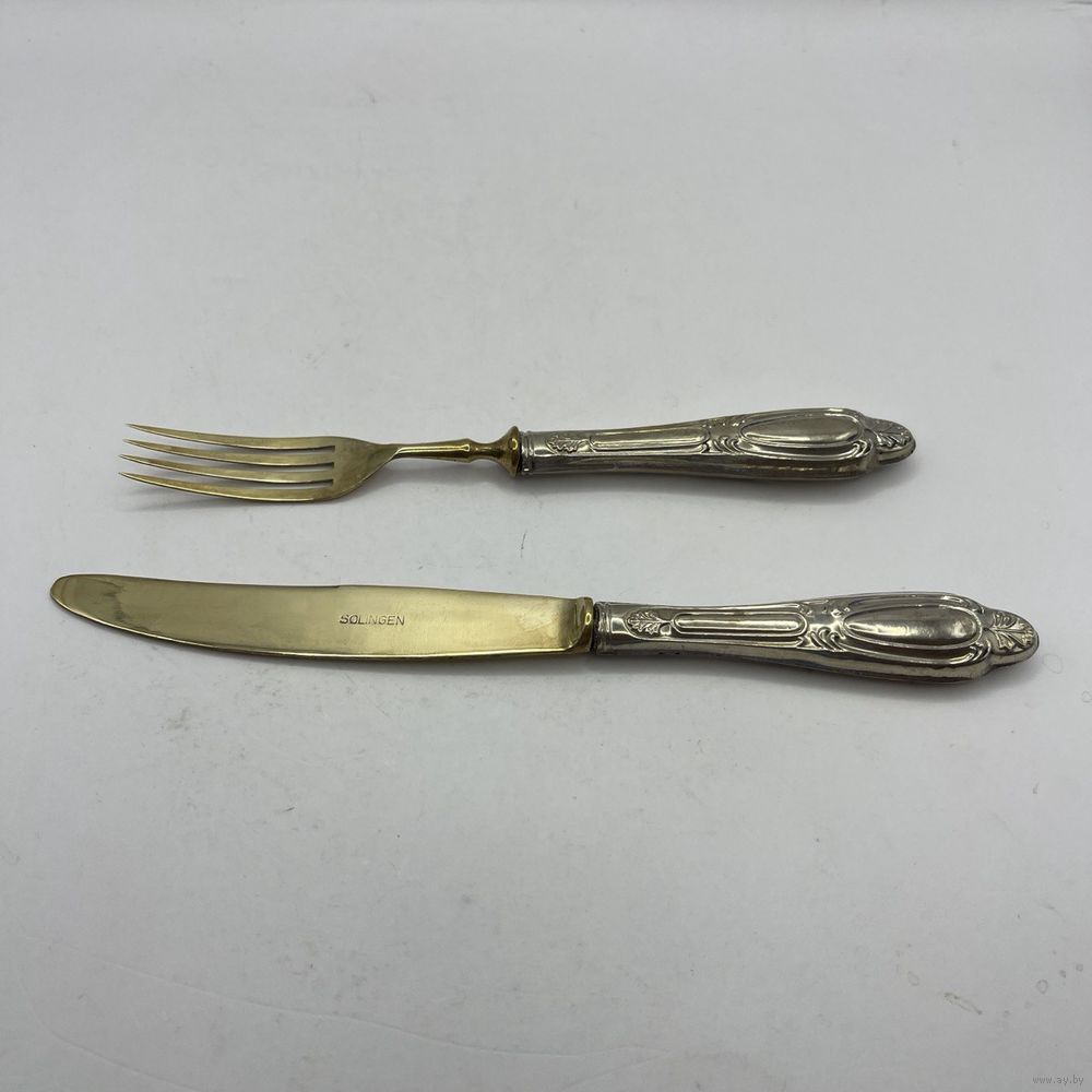 Антикварные десертные приборы, нож и вилка из стали Solingen с позолотой. Рельефные ручки из тисненого металла с глубоким серебрением. Германия. Клеймо Solingen на ноже. 1950-е г.г. Длина ножа 19,5 см, длина вилки 17 см. Естественная патина, следы времени (см. фото).