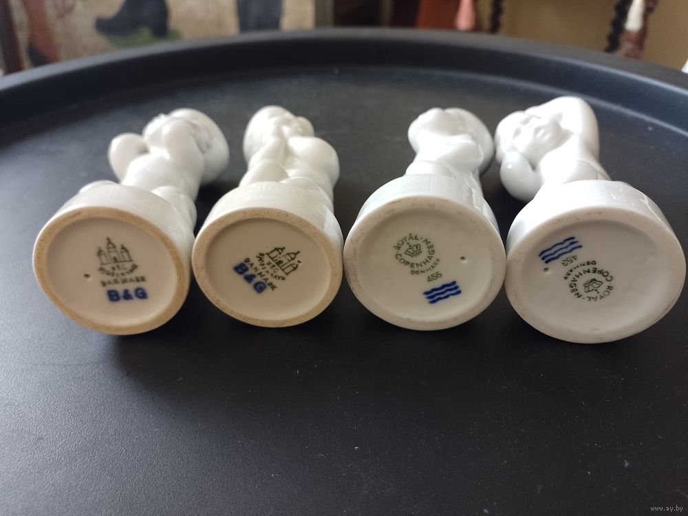 На подошве фигурок нанесена подглазурная маркировка производителя и сухой штамп в массе и инициалами автора
