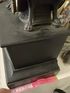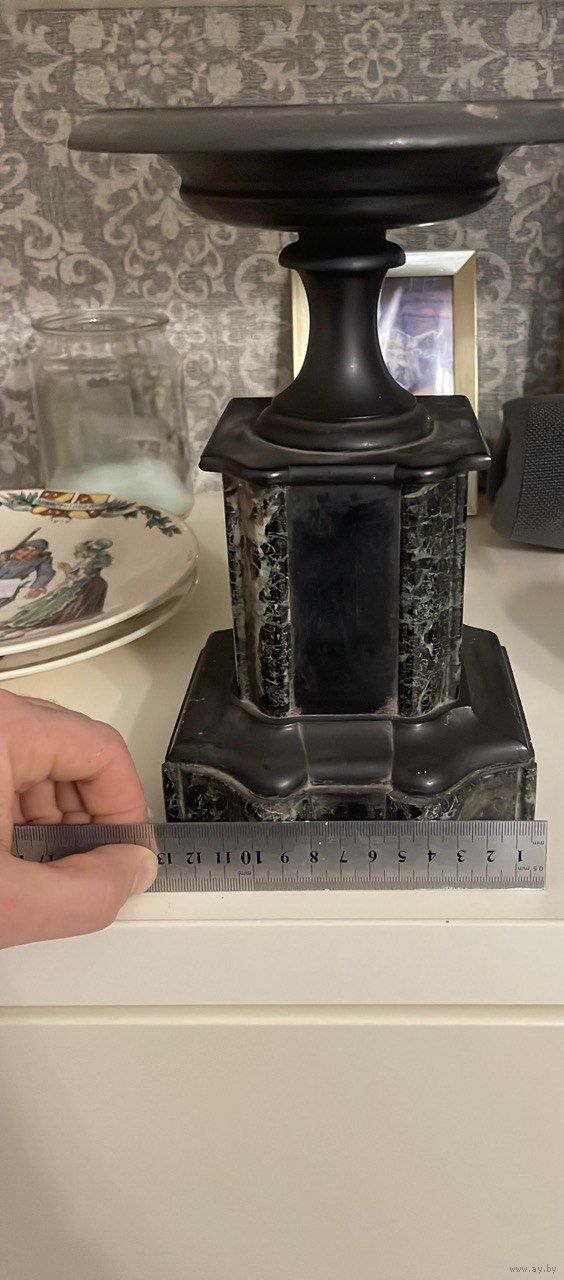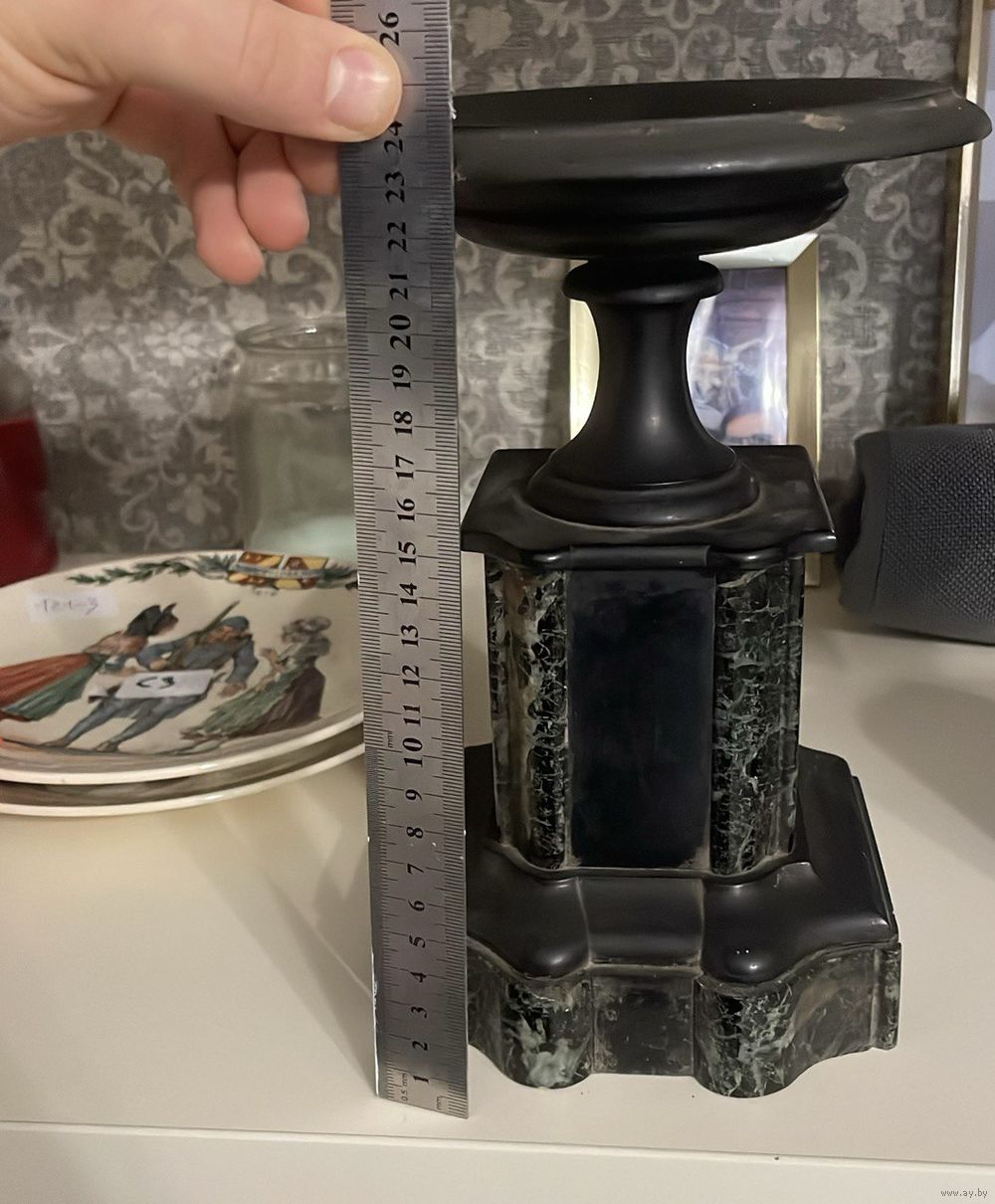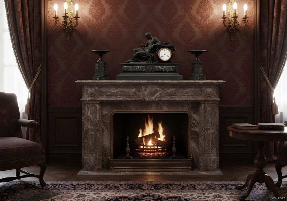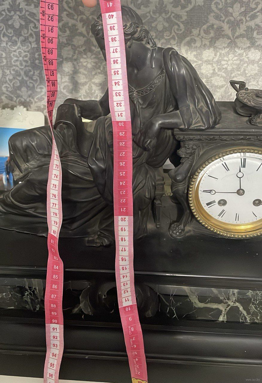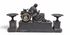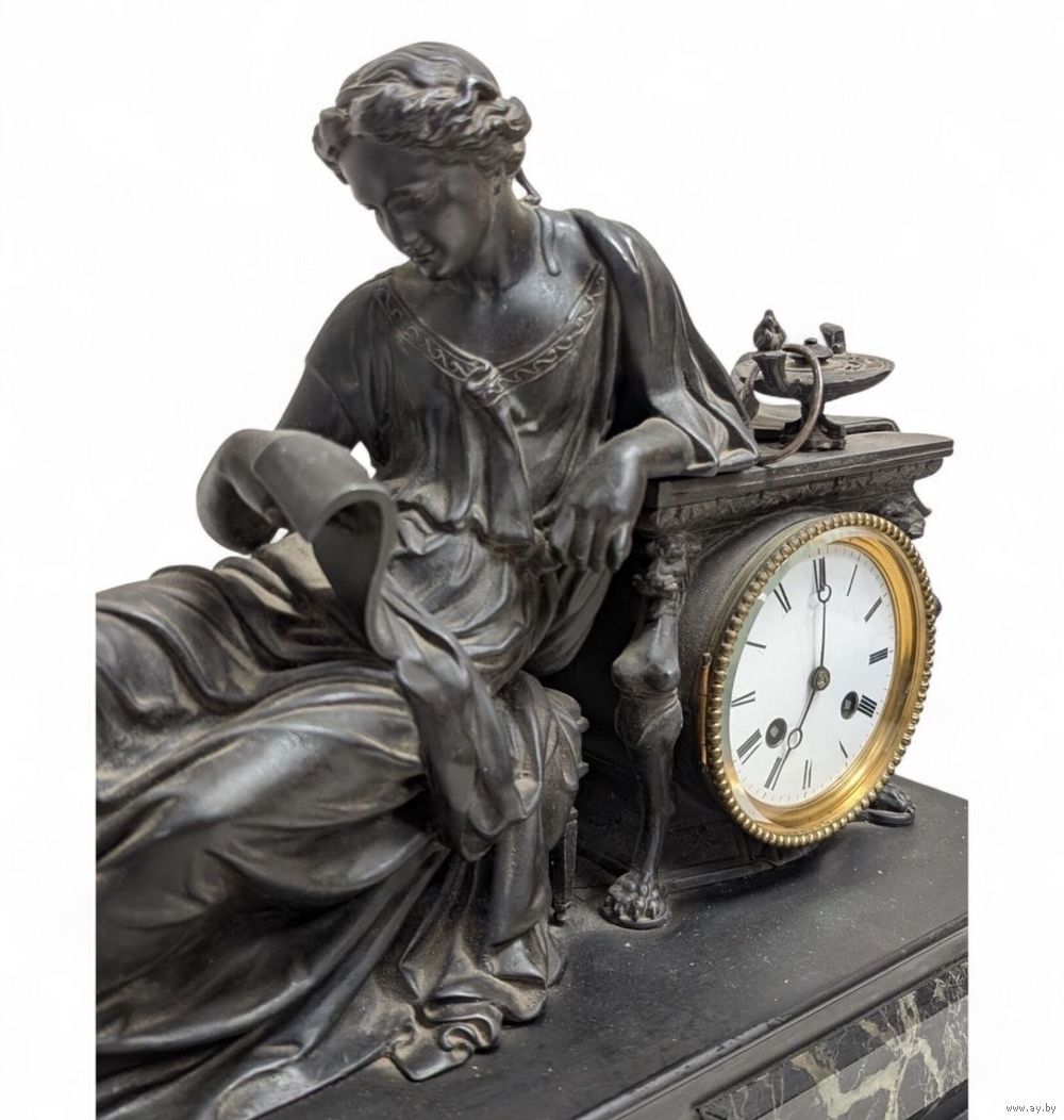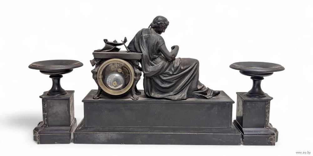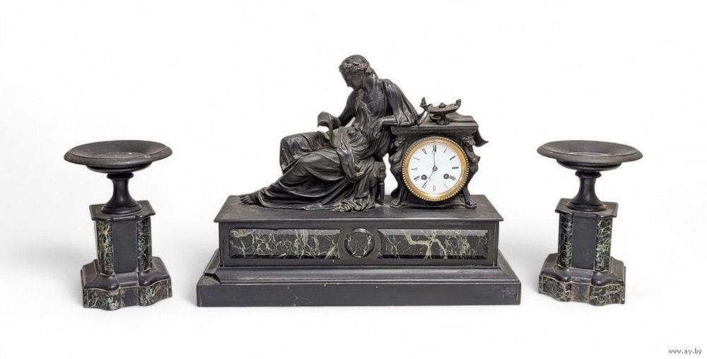 Каминный гарнитур с черной патиной, установленный на основании из черного и морского зеленоватого мрамора. В комплект входят три предмета: часы и пара кассолеток. Часы увенчаны аллегорией чтеца, локоть которого опирается на четырехногий центральный столик с бюстом львицы-кариатиды.