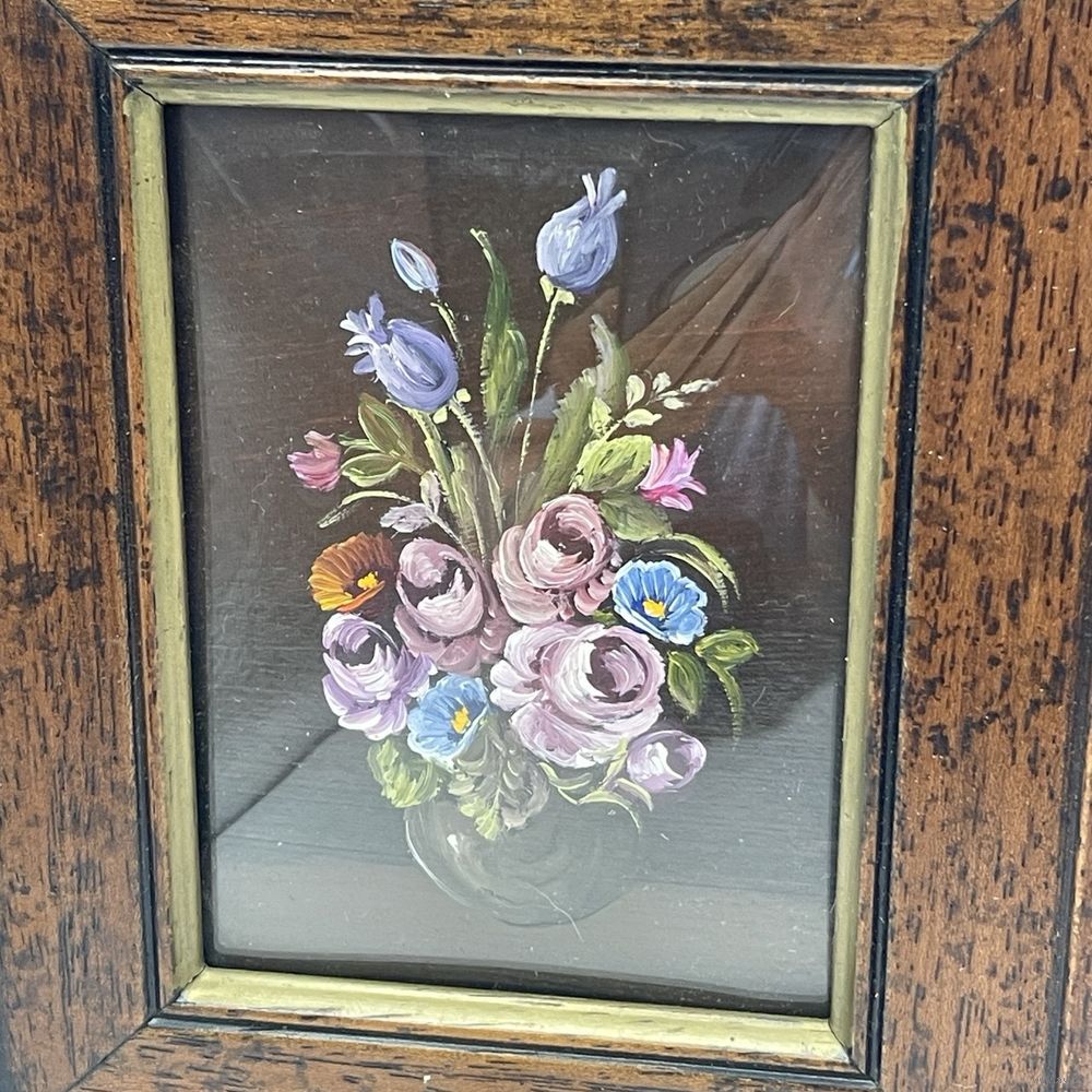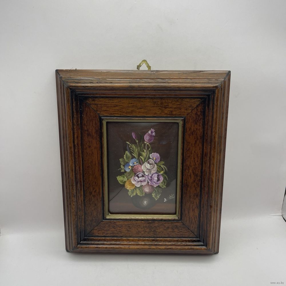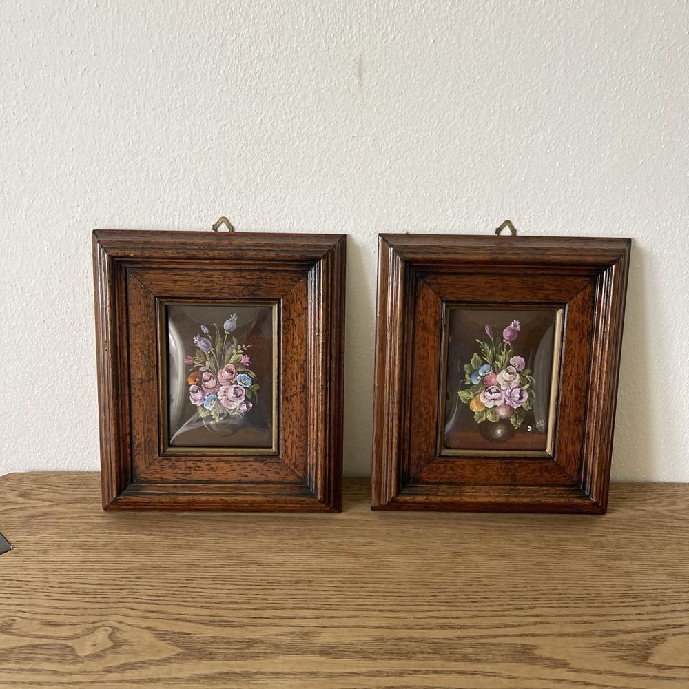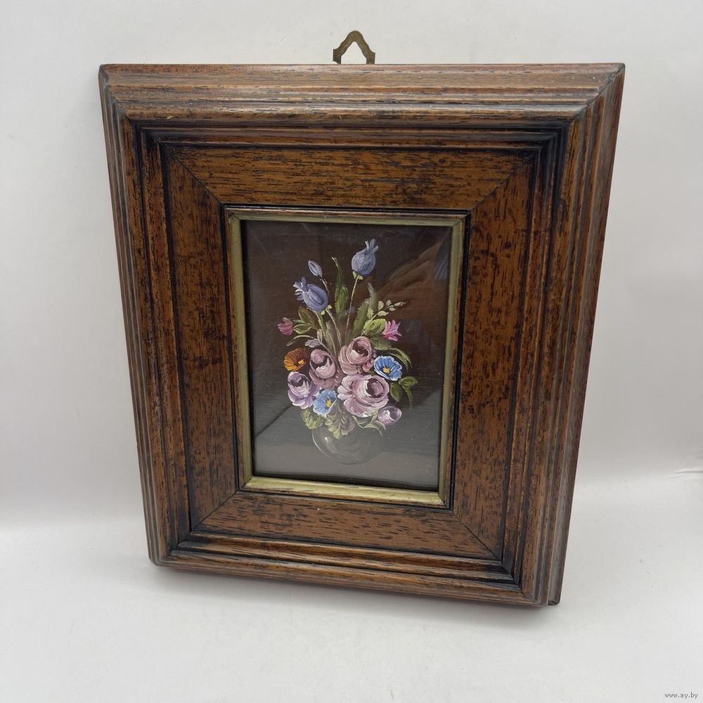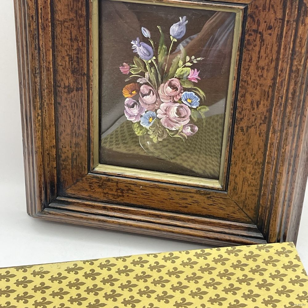 Антикварные парные картины маслом в деревянных рамах из ценных пород дерева ручной работы. Цветочные букеты в вазах с подписью автора под моллированным (выгнутым) стеклом. Италия. 1950-е г.г. Размер 18,5 х 21,5 см. Подвесы для настенного размещения.