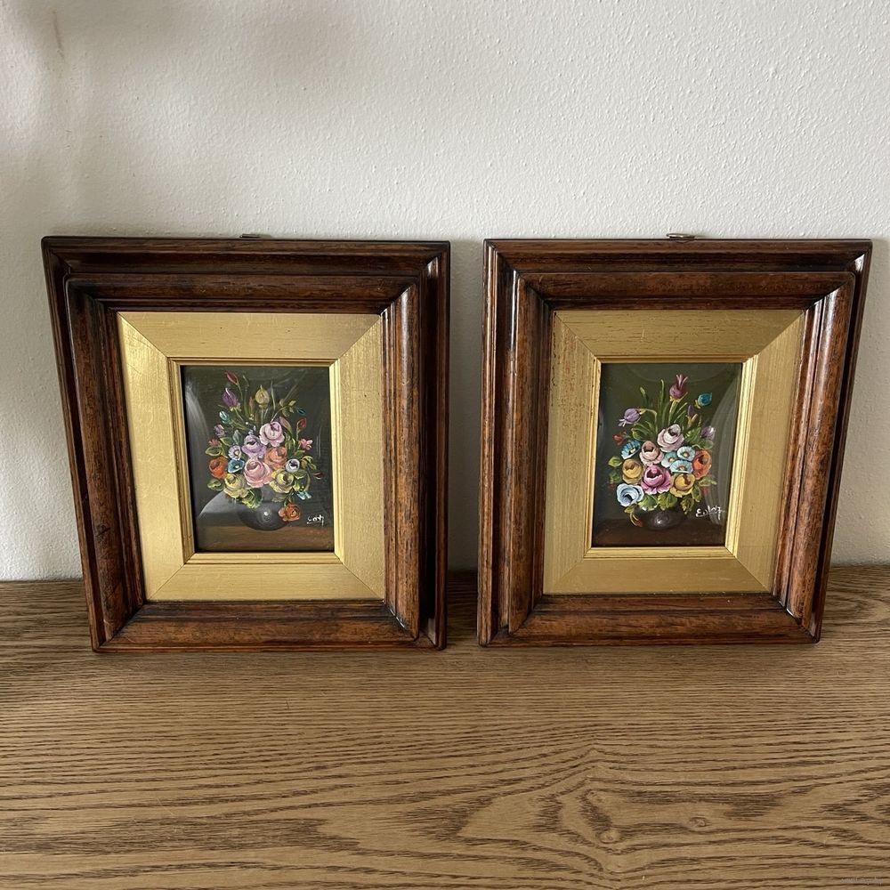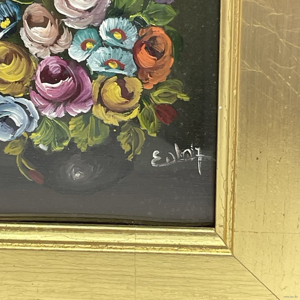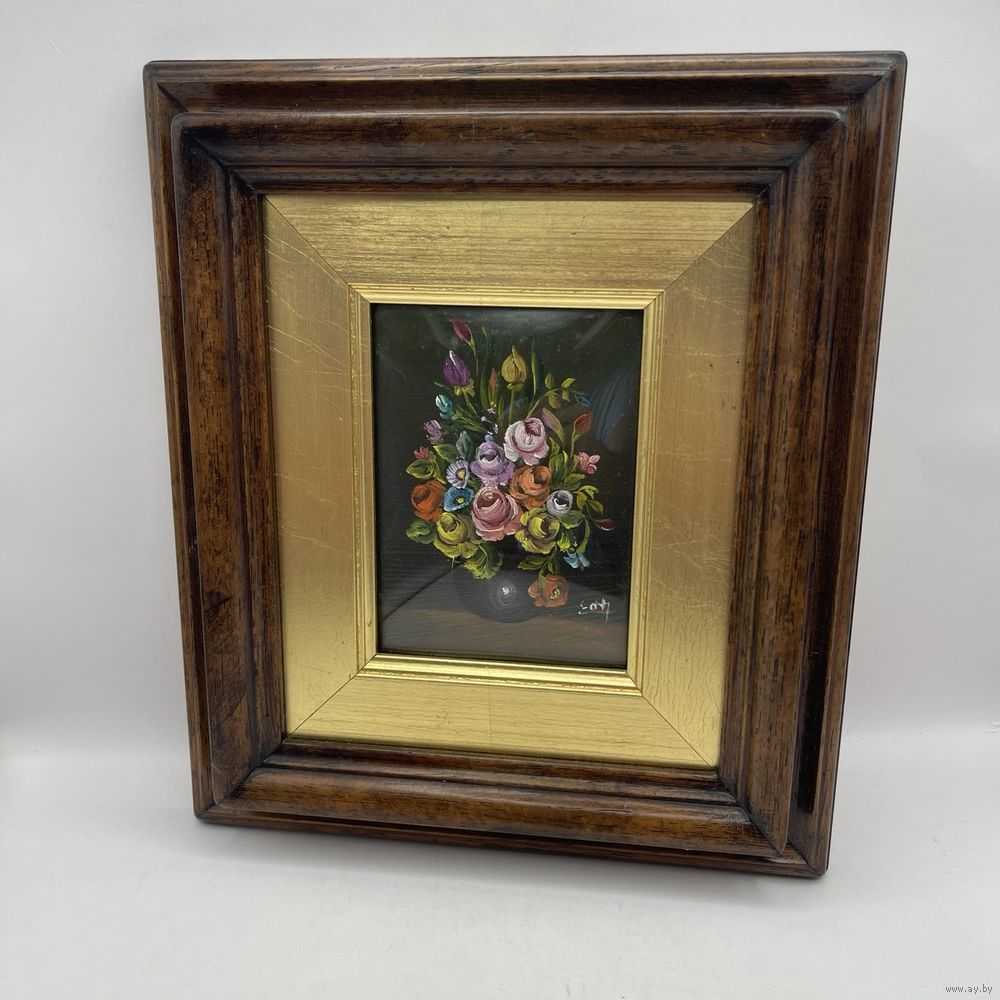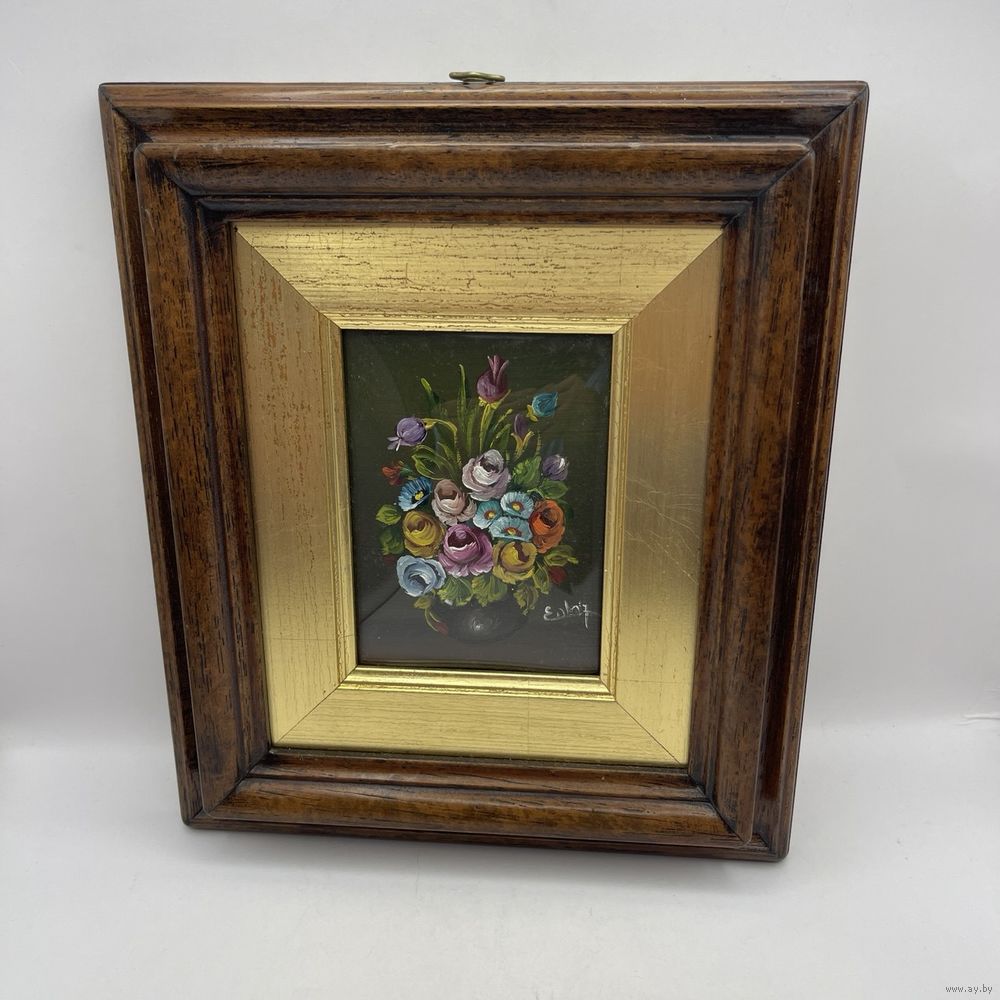 Антикварные парные картины маслом в деревянных рамах из ценных пород дерева ручной работы. Цветочные букеты в вазах с подписью автора под моллированным (выгнутым) стеклом. Италия. 1950-е г.г. Размер 20 х 23,5 см. Подвесы для настенного размещения.
