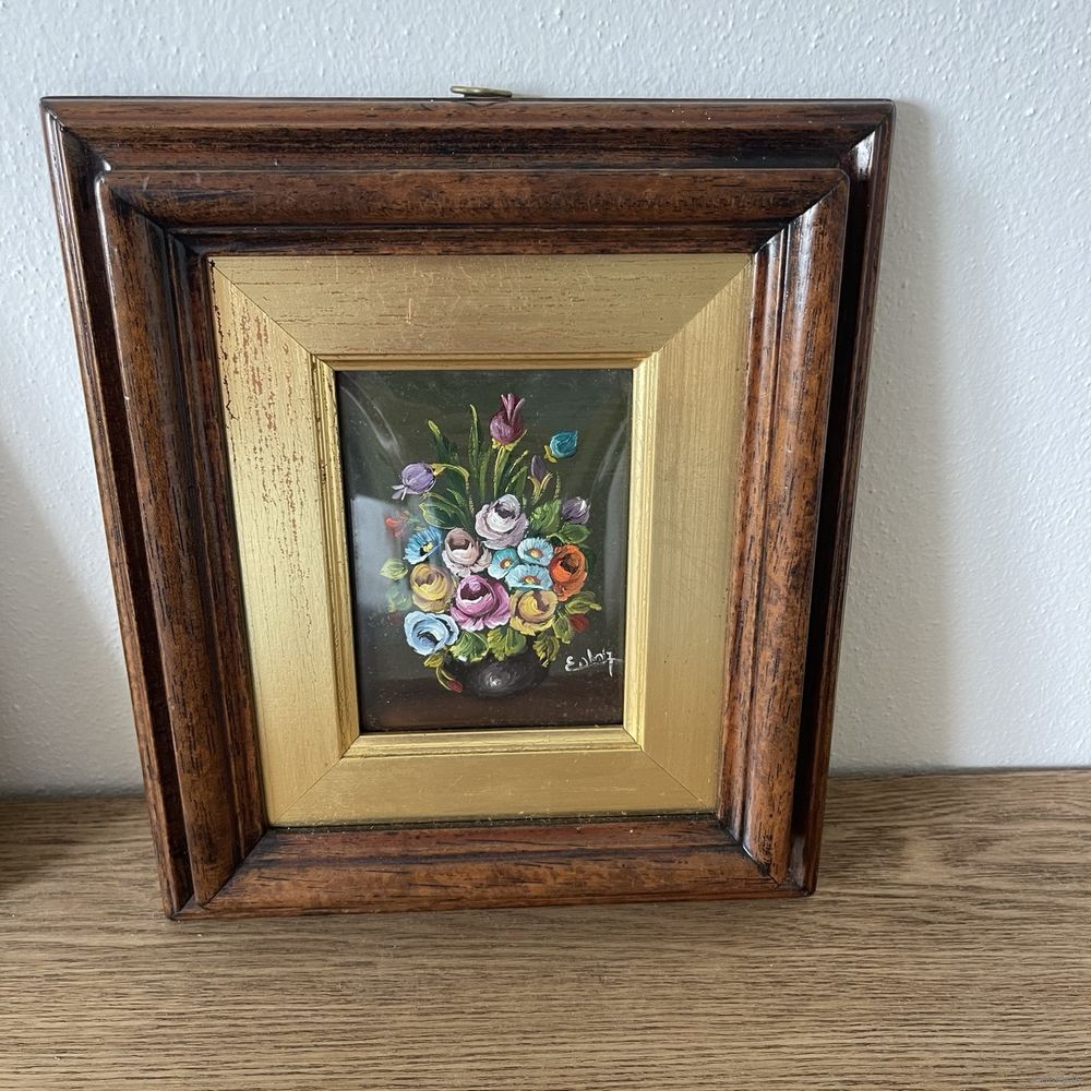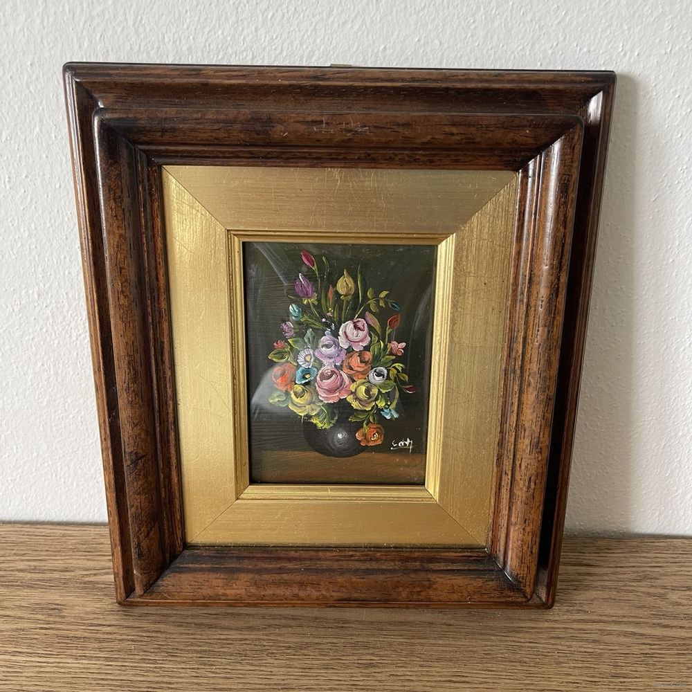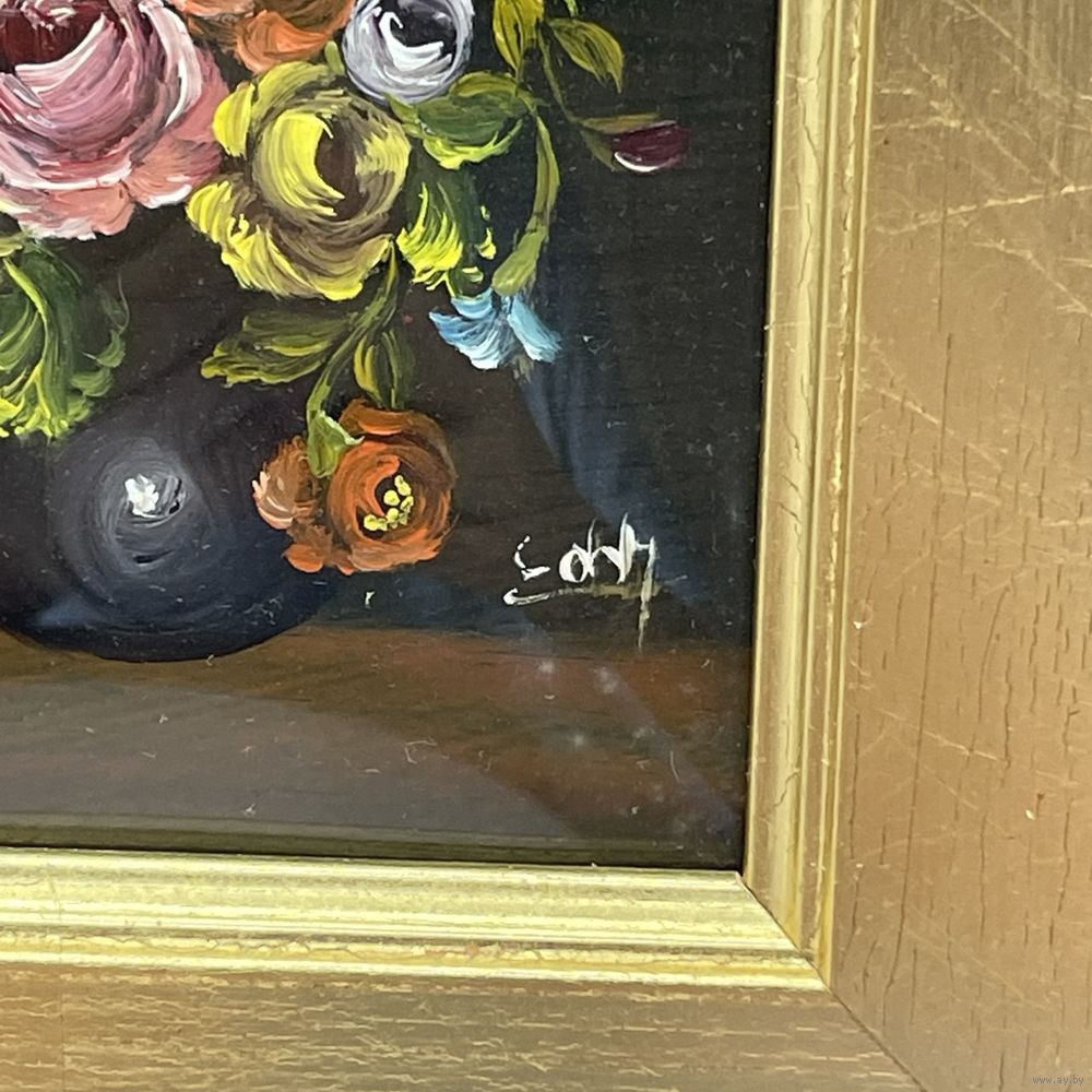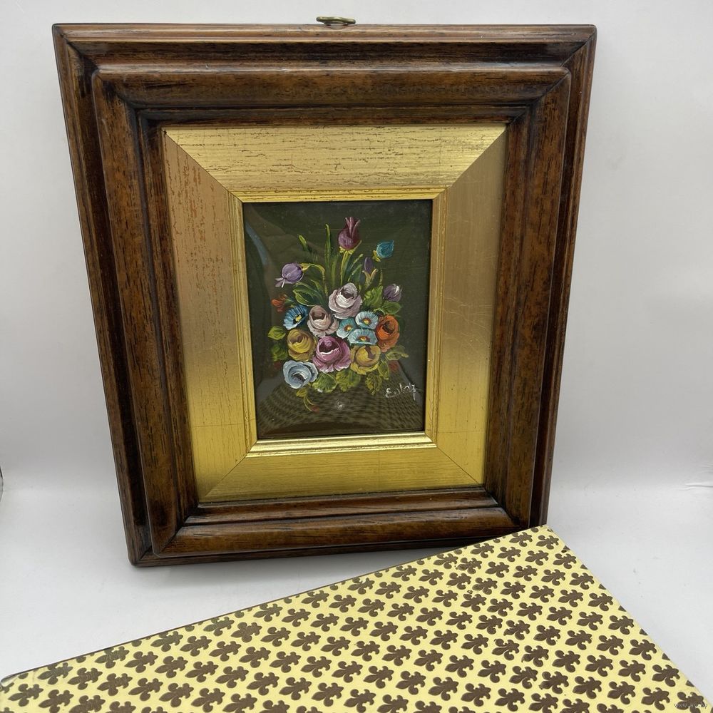 Антикварные парные картины маслом в деревянных рамах из ценных пород дерева ручной работы. Цветочные букеты в вазах с подписью автора под моллированным (выгнутым) стеклом. Италия. 1950-е г.г. Размер 20 х 23,5 см. Подвесы для настенного размещения.