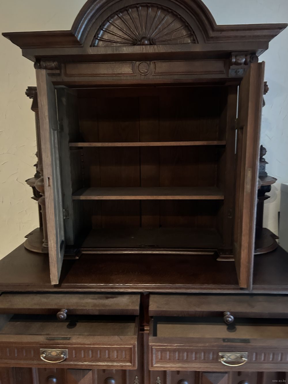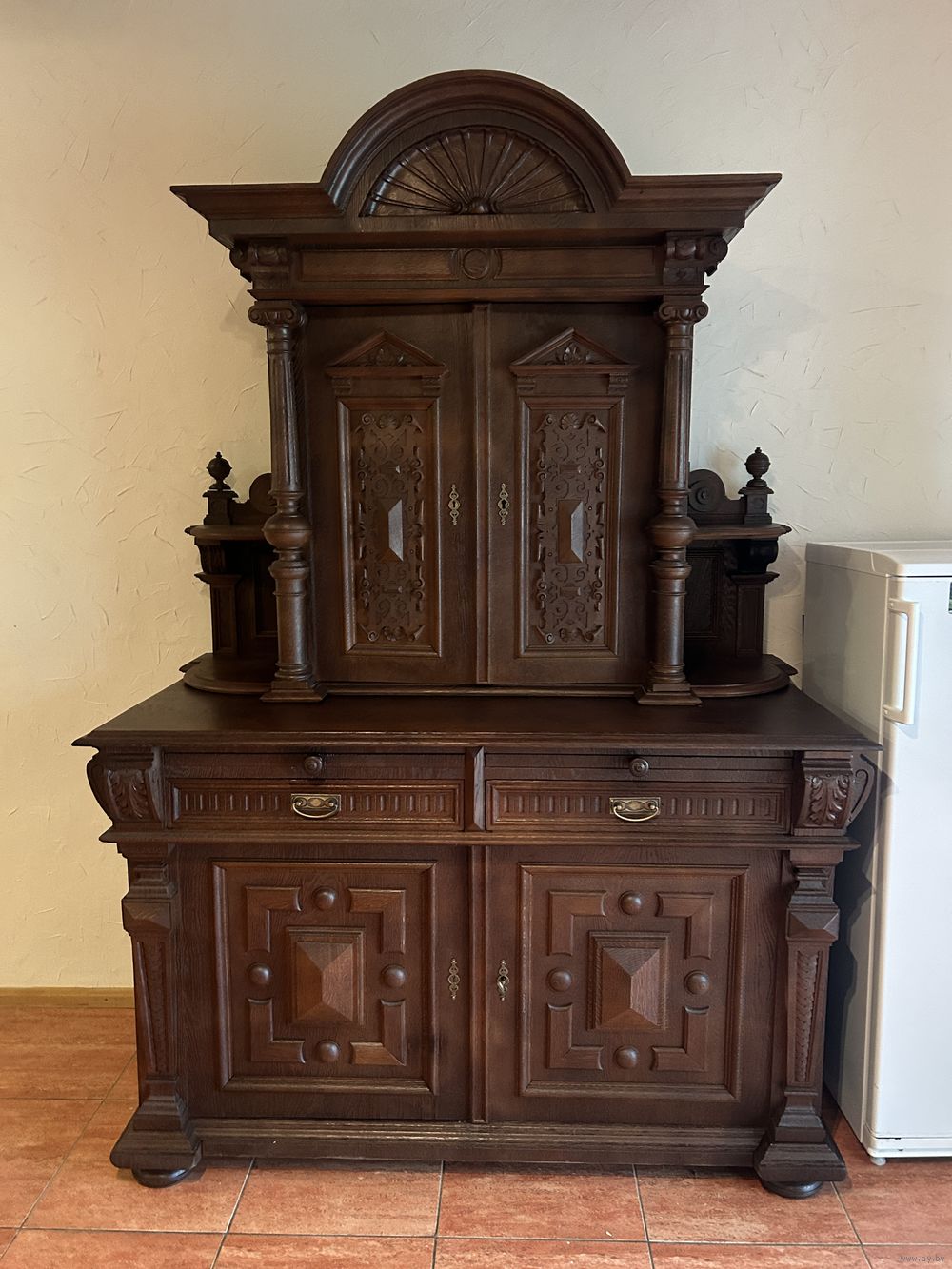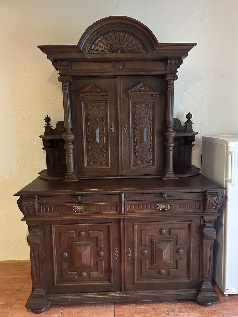 Впечатляющий антикварный буфет конца XIX века, выполненный из массива дуба с невероятно богатой резьбой — подлинный шедевр эпохи историзма. Работа французских столяров с вниманием к каждой детали: резные фигуры, архитектурные элементы — всё исполнено вручную и с большой художественной силой.