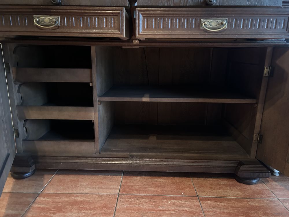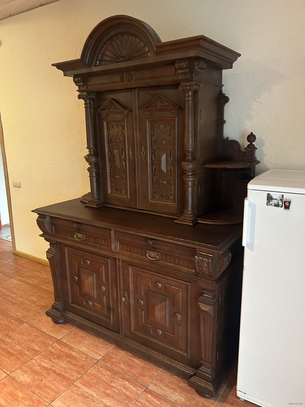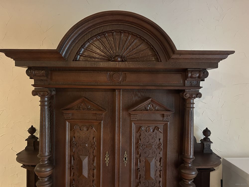 Впечатляющий антикварный буфет конца XIX века, выполненный из массива дуба с невероятно богатой резьбой — подлинный шедевр эпохи историзма. Работа французских столяров с вниманием к каждой детали: резные фигуры, архитектурные элементы — всё исполнено вручную и с большой художественной силой.