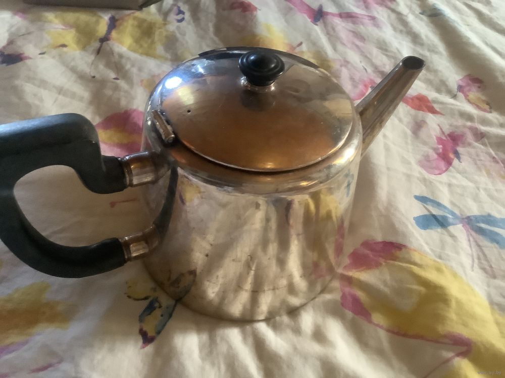 Большой антикварный чайник , гальваническое Серебрение, клеймо 14 см х 23 см, внутри покрытие сошло, Ручка похожа на Бакелит, в коллекцию ,ручная работа , есть клеймо