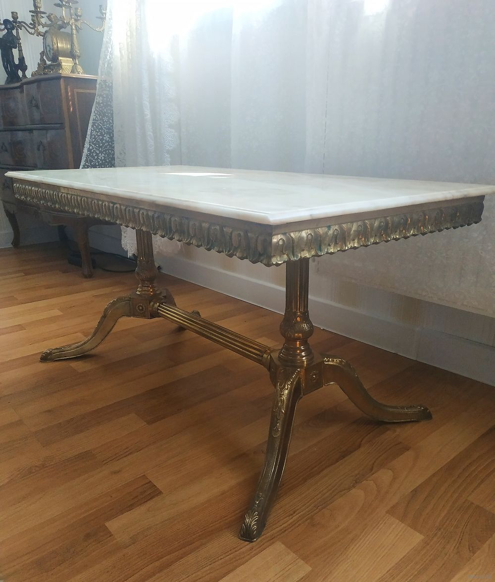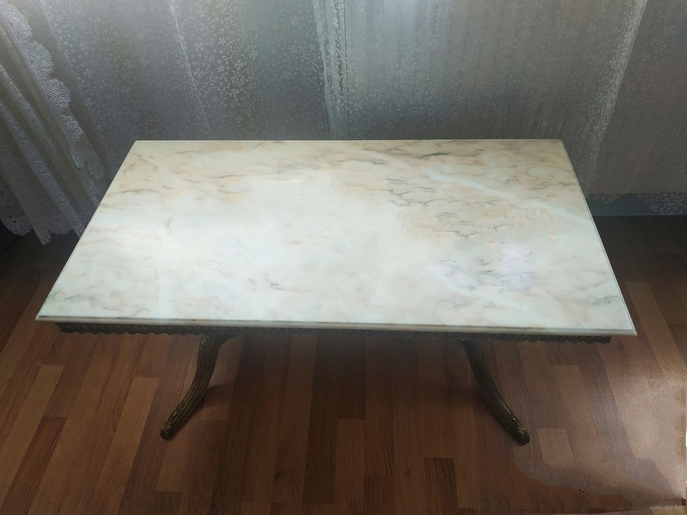 Этот журнальный столик представляет собой классический предмет мебели в стиле французского ампира или барокко. Он отличается ониксовой столешницей, которая опирается на богато украшенную раму из бронзы. Плита из оникса с характерной текстурой. Стойка: массивное бронзовое основание, с центральным соединительным стержнем (растяжкой) между ножками. Элементы дизайна:рифленые изогнутые ножки кабриолета, а также рельефные орнаменты по периметру обода. Происхождение: Франция 1930 -1940 годы.