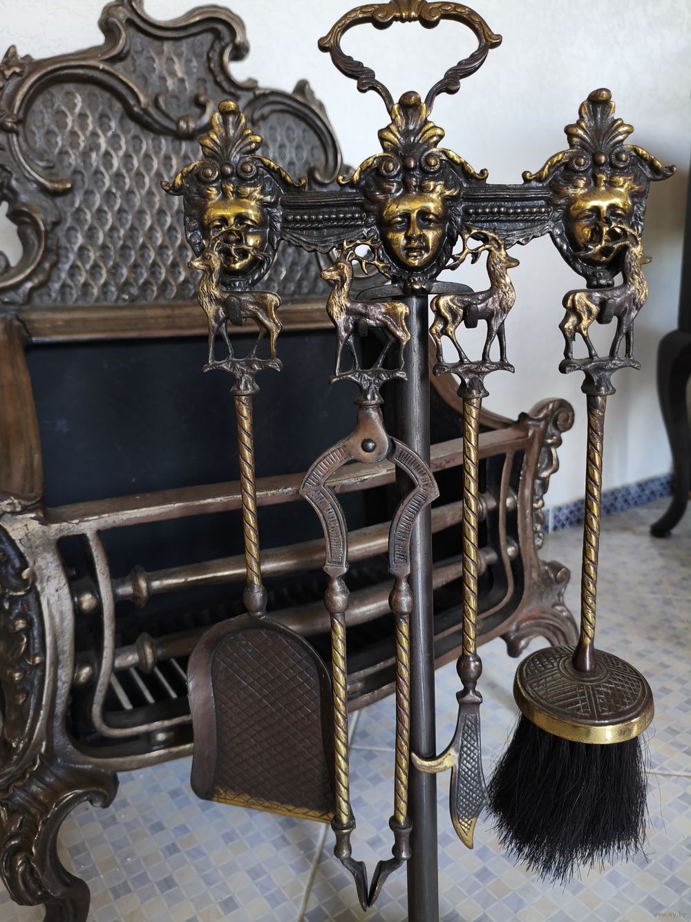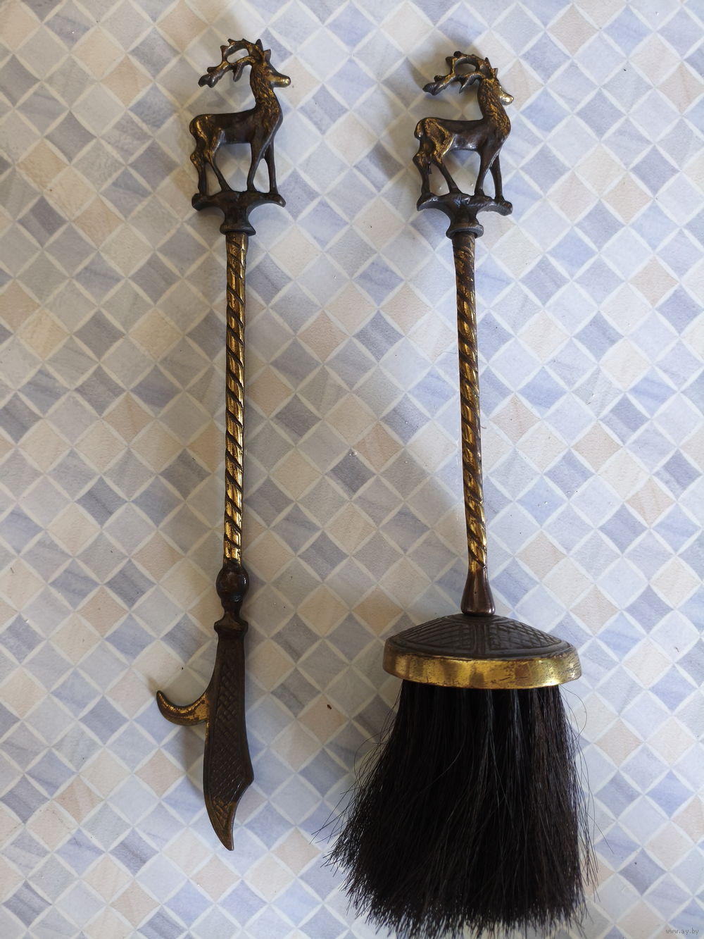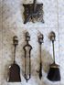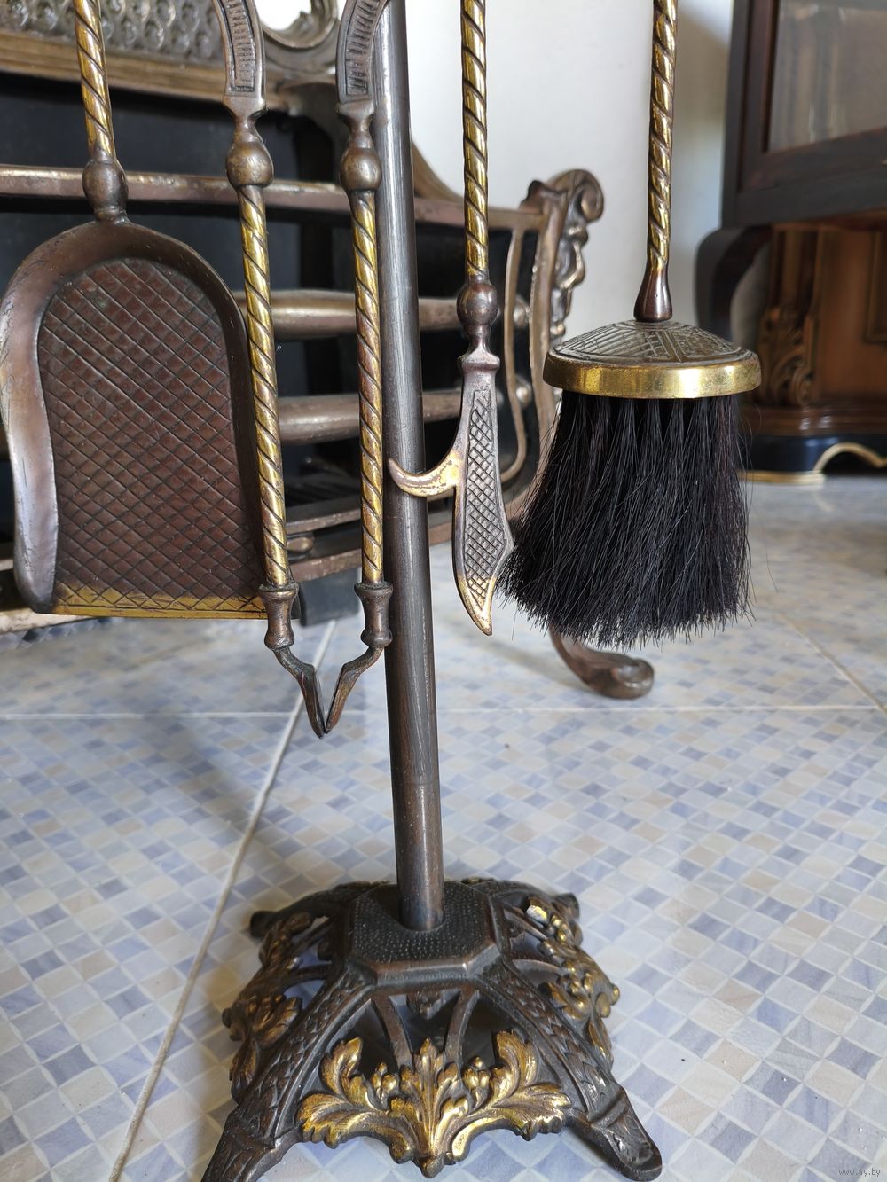 Каминные принадлежности : кочерга, щетка, совок и щипцы.