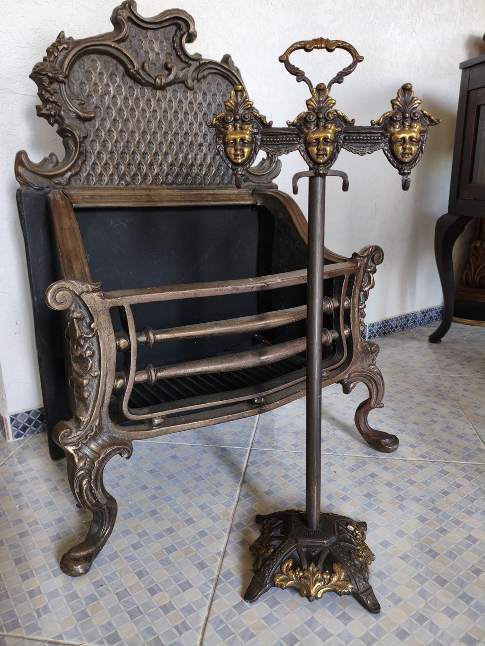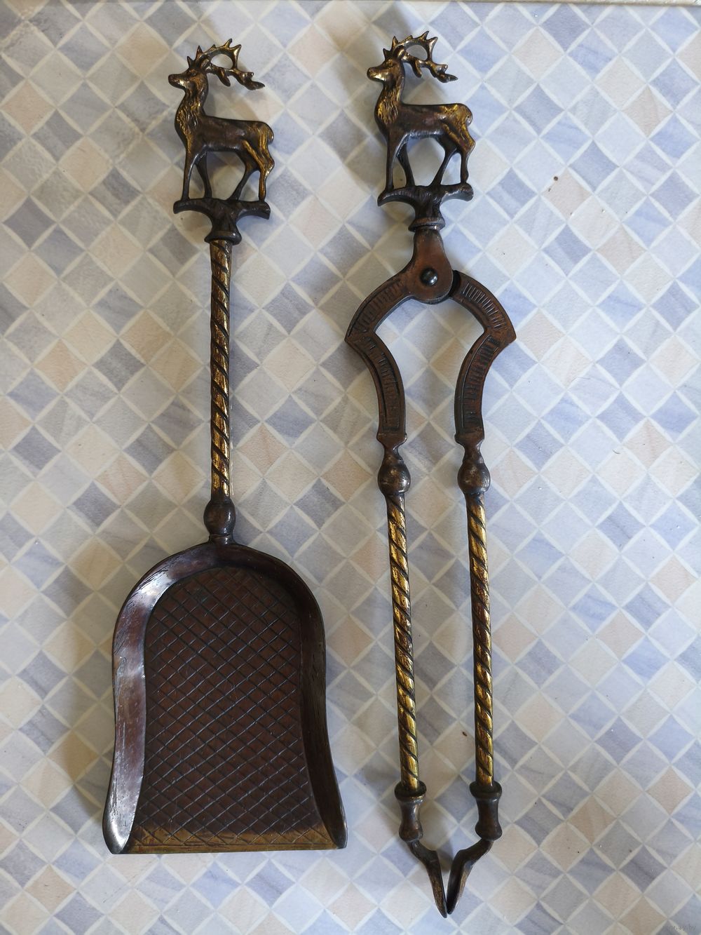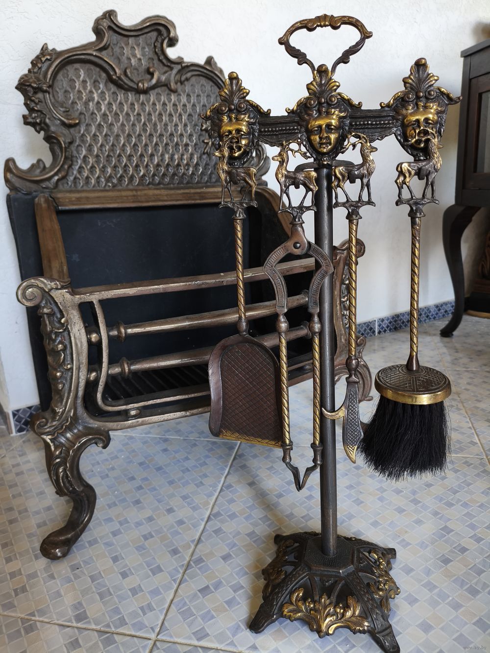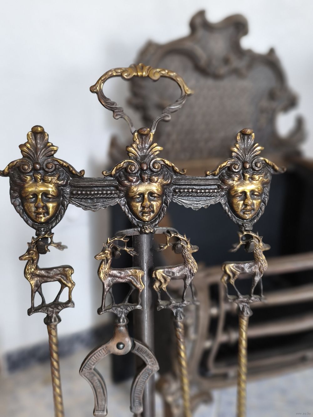 Каминные принадлежности : кочерга, щетка, совок и щипцы.