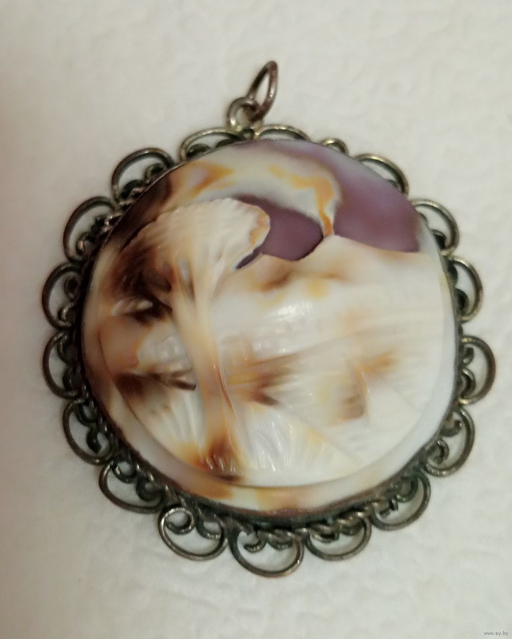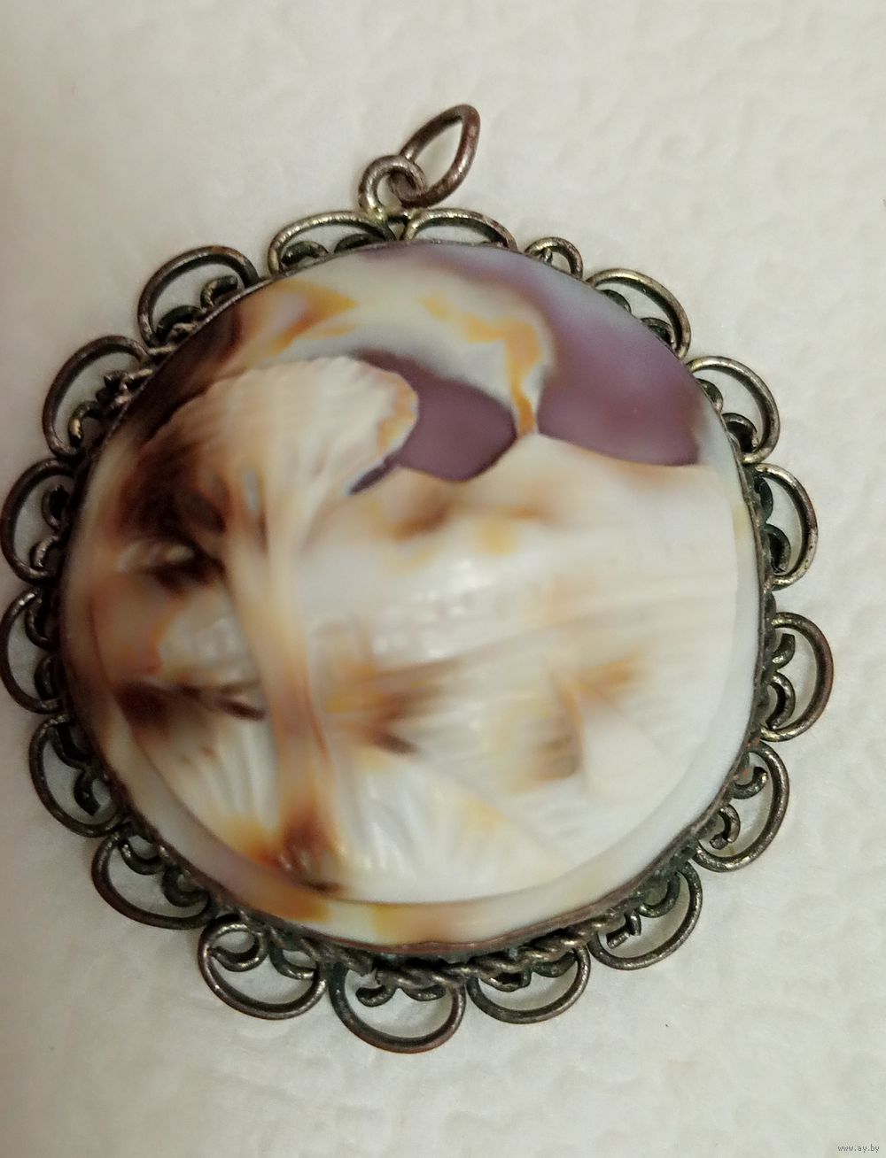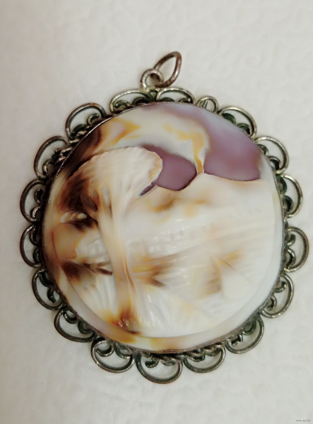 Антикварный, очень уникальный старинный кулон-камея из раковины, изображающий сцену извержения вулкана Везувий в Помпеях.