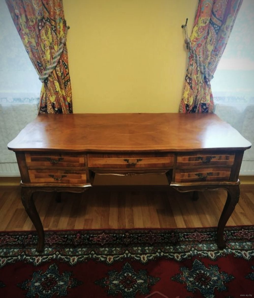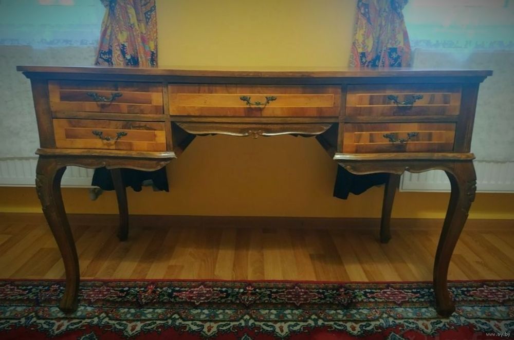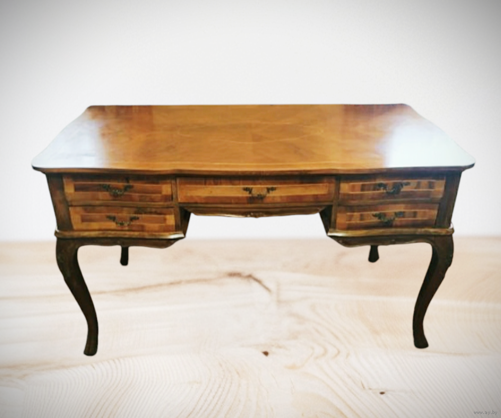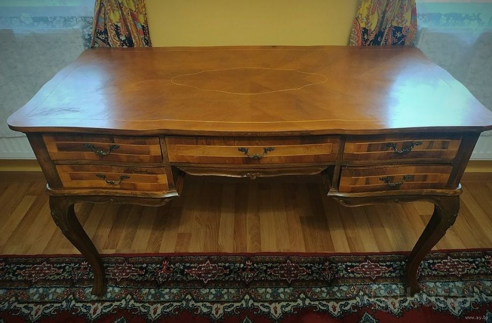Антикварный письменный стол в стиле барокко или Людовика XV (стильная мебель), часто называемый в стиле Чиппендейл, сделанный из орехового дерева с отделкой шпоном и инкрустацией. Письменный стол имеет типичные черты стиля барокко (особенно Людовика XV во Франции или Чиппендейла в Англии), включая изогнутые линии, волнистые ножки и профилированный край стола.