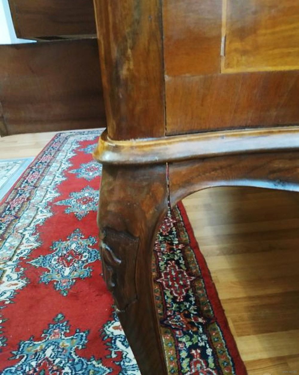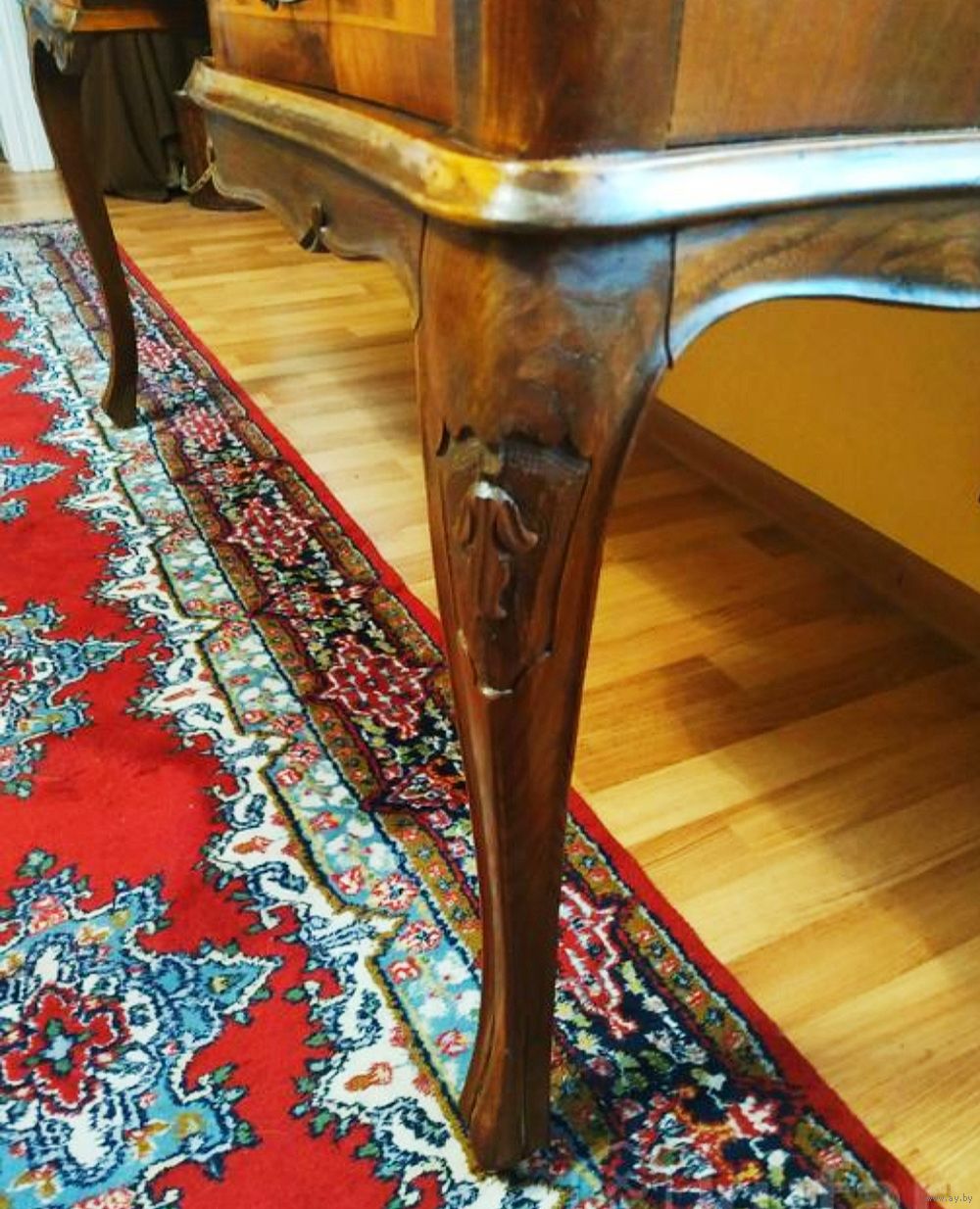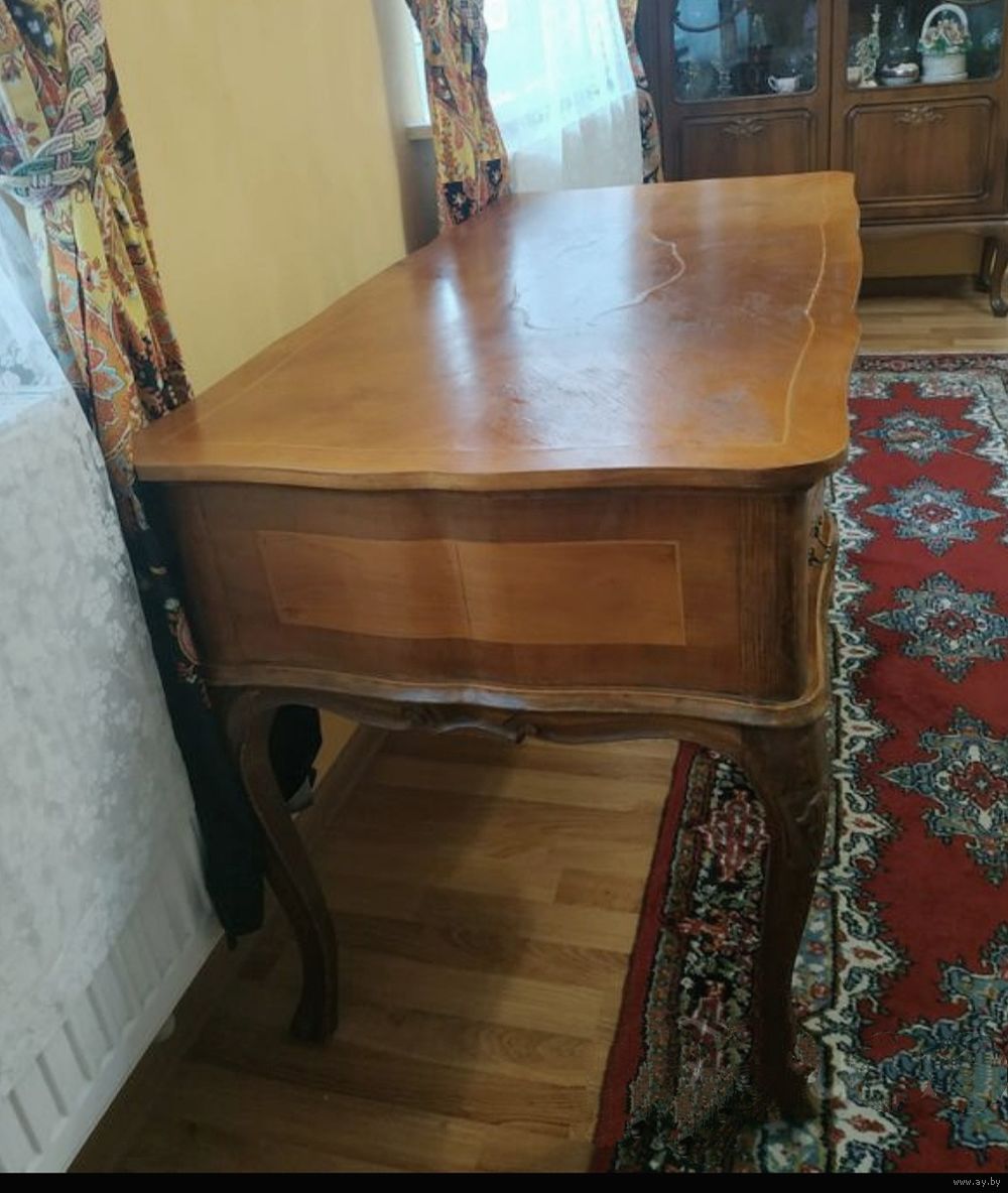 Антикварный письменный стол в стиле барокко или Людовика XV (стильная мебель), часто называемый в стиле Чиппендейл, сделанный из орехового дерева с отделкой шпоном и инкрустацией. Письменный стол имеет типичные черты стиля барокко (особенно Людовика XV во Франции или Чиппендейла в Англии), включая изогнутые линии, волнистые ножки и профилированный край стола.